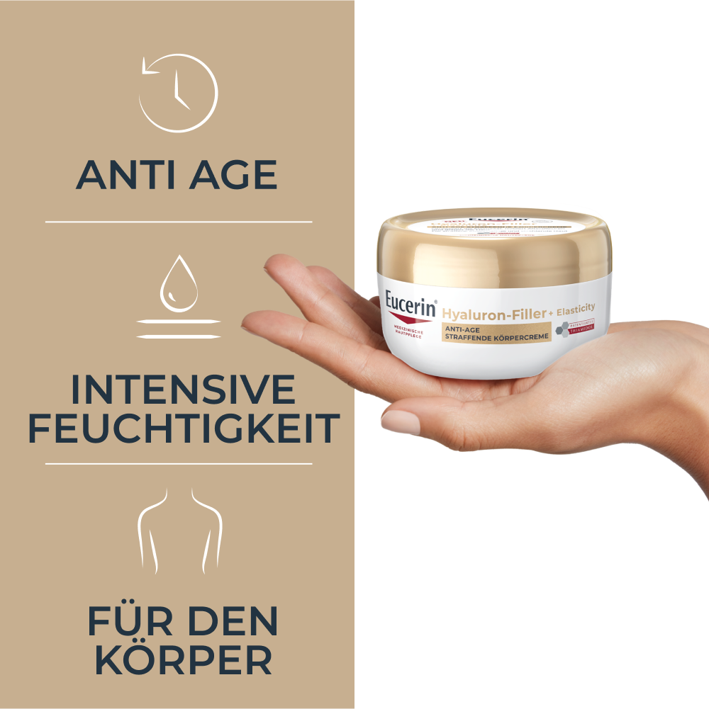 Die Hyaluron Filler + Elasticity Straffende Körpercreme bietet mit einzigartiger, dreifach wirkender Formel mehrere Anti-Aging-Vorteile, um fortgeschrittene Zeichen der Hautalterung zu mildern: Der einzigartige Inhaltsstoff Arctiin von Eucerin stimuliert die Kollagenproduktion und kann die Hautelastizität verbessern. Das patentierte Thiamidol in der Anti-Aging Creme mildert Altersflecken sichtbar und so lässt die Hyaluron Bodylotion die Haut ebenmäßiger und jünger wirken. Eucerins innovative Mischung aus hoch- und niedermolekularer Hyaluronsäure spendet intensive Feuchtigkeit, die die Haut regeneriert und glättet. Das Ergebnis bei Anwendung der Feuchtigkeitslotion: ebenmäßigere, straffere und jünger aussehende Haut. Die Creme wirkt gegen Falten am ganzen Körper, wie z.B. Falten am Hals oder faltige Haut an den Armen.