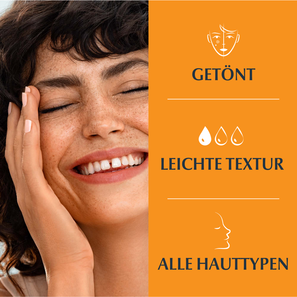 Mitteldunkle Farbpigmente in der mattierenden Sonnencreme gleichen Hautunebenheiten und Hautunreinheiten aus und der Teint erscheint strahlend und gleichmäßig.