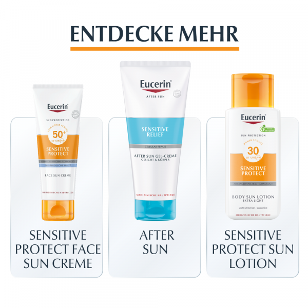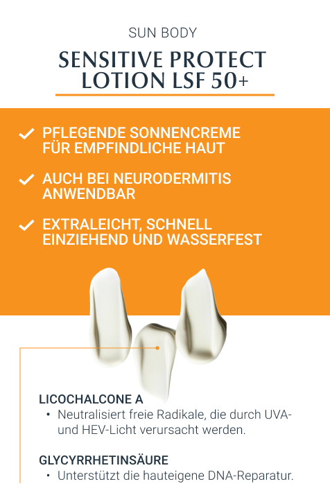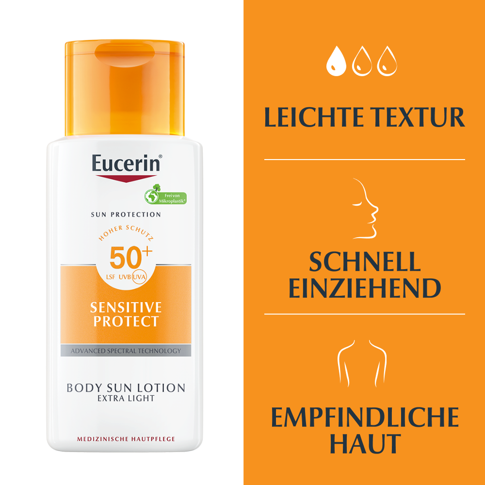 Neben UV-Strahlung kann auch das hochenergetische sichtbare Licht (HEV-Licht) die Haut beschädigen. Um dies zu verhindern und die Haut effektiv zu schützen, ist die Eucerin Sensitive Protect Body Sun Lotion Extra Light LSF 50+ mit der Advanced Spectral Technology ausgestattet. In dieser Technologie kombiniert die Sonnencreme UVA/UVB-Filter mit Licochalcone A zur Neutralisation freier Radikale, die durch UV- und HEV-Licht ausgelöst werden. Zudem unterstützt Glycyrrhetinsäure den natürlichen Heilungsprozess der DNA.