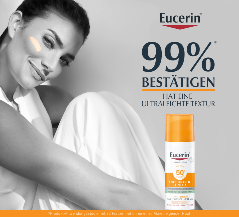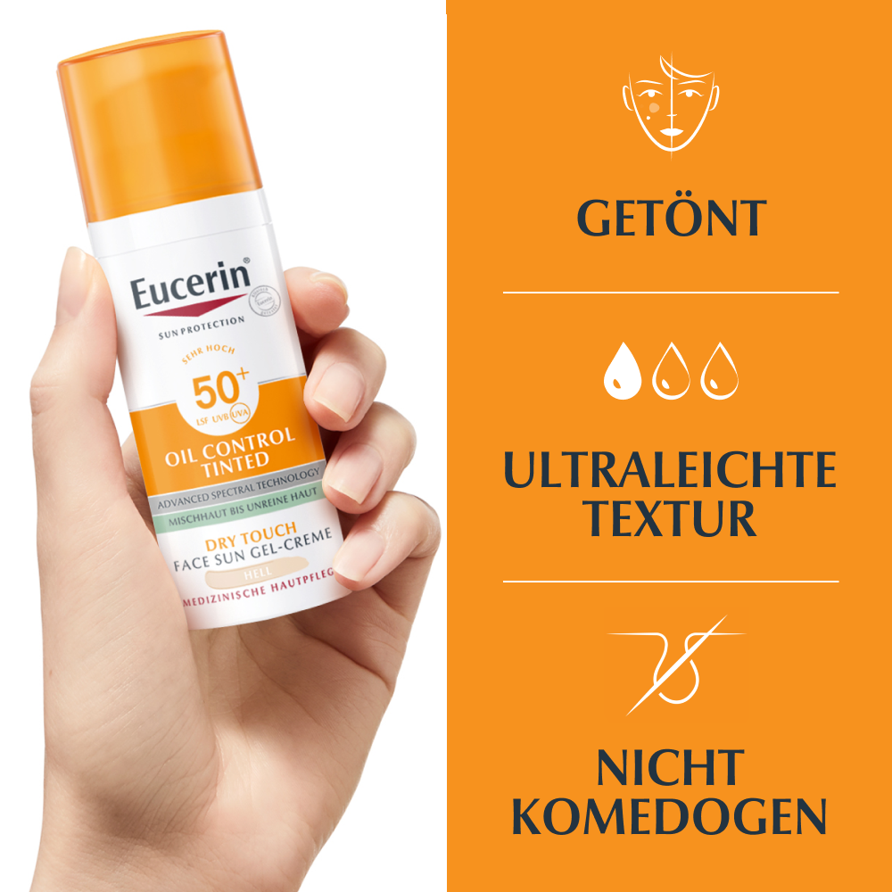 Eucerin Oil Control Tinted Face Sun Gel-Creme LSF 50+ Hell ist ein Sonnenschutz mit Farbpigmenten für die tägliche Anwendung für unreine, zu Akne neigende Haut.