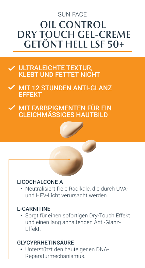 Die Oil Control-Technologie mit L-Carnitin und absorbierenden Mikropartikeln verleiht der Haut sofort ein trockenes Finish, sodass die mattierende Sonnencreme einen 12 Stunden Anti-Glanz-Effekt erzielt.