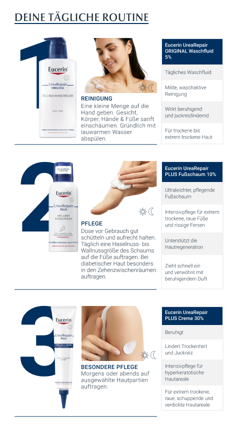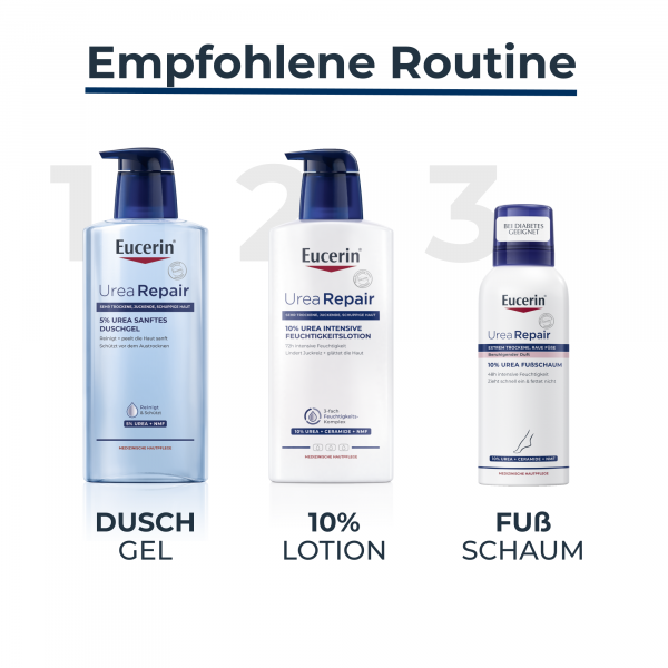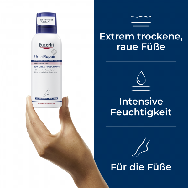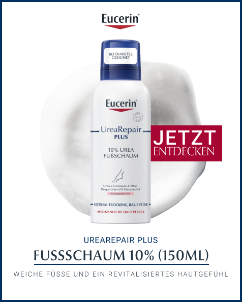 Gerade an den Füßen kann die Haut schnell trocken werden. Um trockenen, rauen Füßen ihre Geschmeidigkeit zurückzugeben, eignet sich der Eucerin UreaRepair PLUS Fußschaum ideal. Auf der Basis einer Öl-in-Wasser-Emulsion sorgen verschiedene Pflegewirkstoffe für glatte, weiche Füße. 10 % Urea und natürliche Feuchthaltefaktoren (NMF) spenden bis zu 48 Stunden Feuchtigkeit und reduzieren Hornhaut und Verdickungen der Haut. Zusätzlich sorgen Ceramide für eine gestärkte Hautbarriere, um Feuchtigkeitsverlust zu verhindern. Dexpanthenol stimuliert die Regeneration der Haut und revitalisiert strapazierte Füße. Als weiterer Wirkstoff enthält der Pflegeschaum Decandiol, welches das Risiko für Hautinfektionen wie etwa Fußpilz reduziert. Die Anwendung ist so leicht wie bei einer Fußcreme, denn der Urea Schaum lässt sich leicht verteilen und zieht schnell ein. Dabei verwöhnt der Schaum mit einem beruhigenden Duft und eignet sich ebenso zur Fußpflege bei Diabetes, Xerose und Psoriasis.