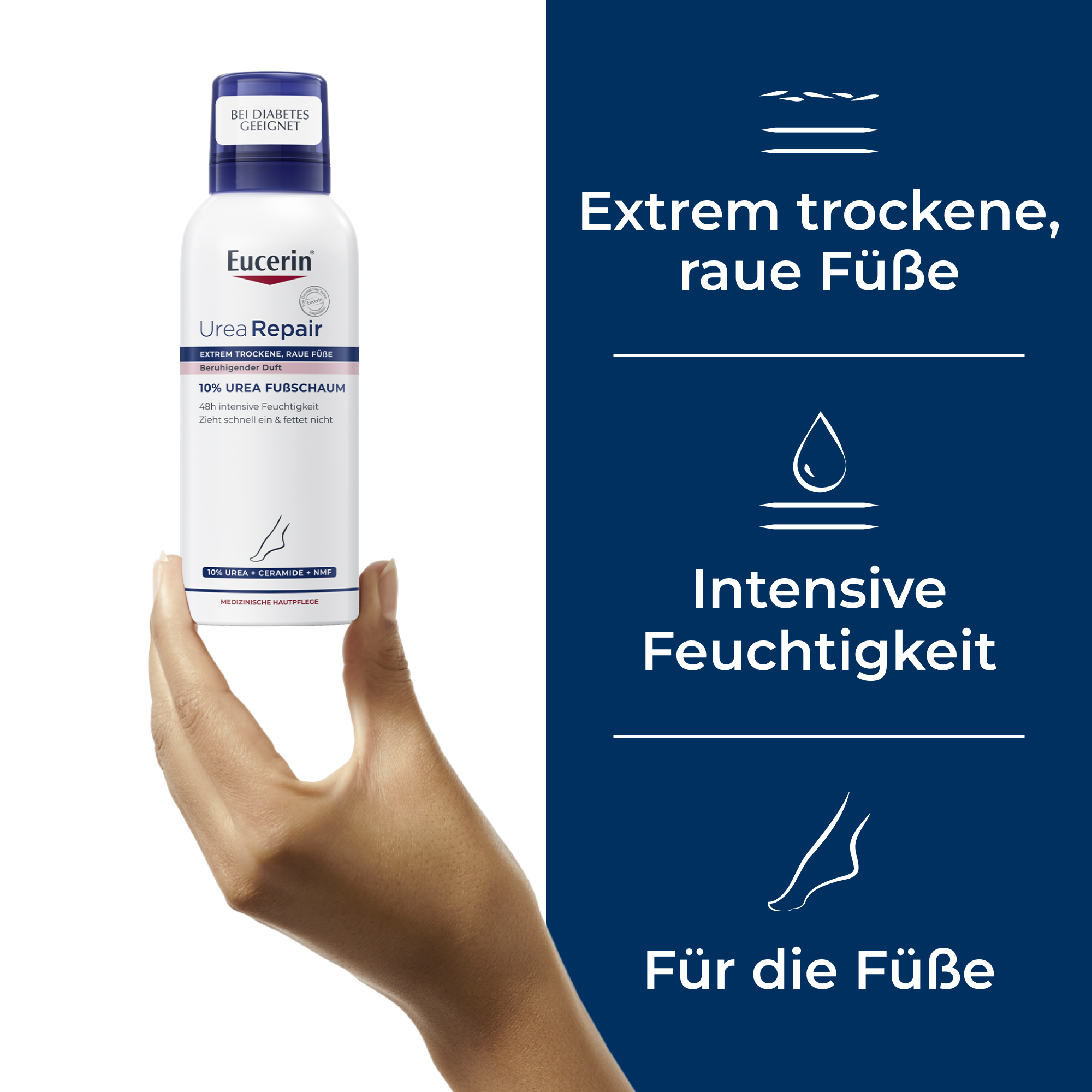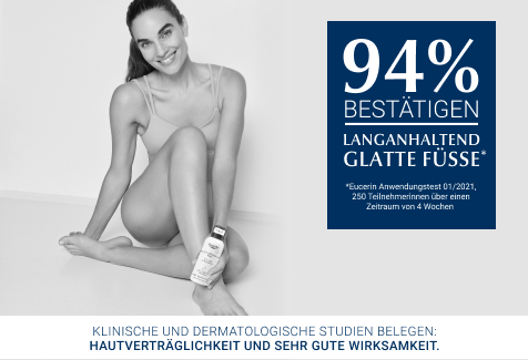 Klinische und dermatologische Studien bestätigen die sehr gute Wirksamkeit und Verträglichkeit der Urea Pflege, auch für die diabetische Haut und beim Tragen von Kompressionsstrümpfen. Im Test stellten 94 % der Anwender fest, dass der neue Eucerin Fußschaum die Füße langanhaltend glättet. 96 % bestätigten, dass die trockene Haut sofort gelindert, regeneriert und revitalisiert wird.*