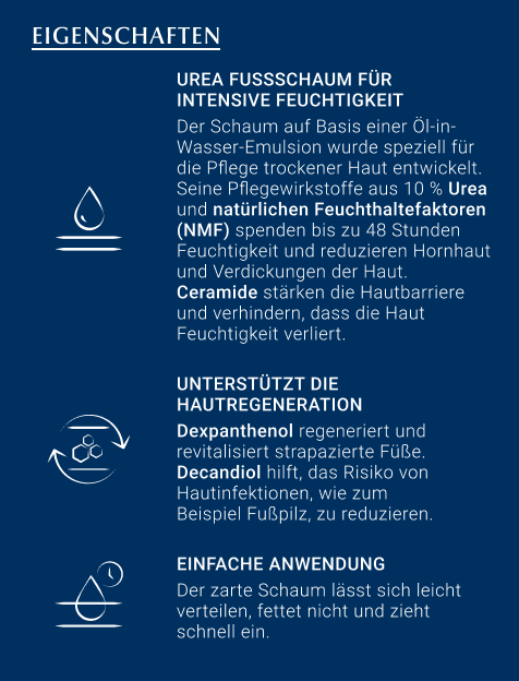 • Pflegeschaum mit Urea sorgt 48 h für geschmeidige Füße