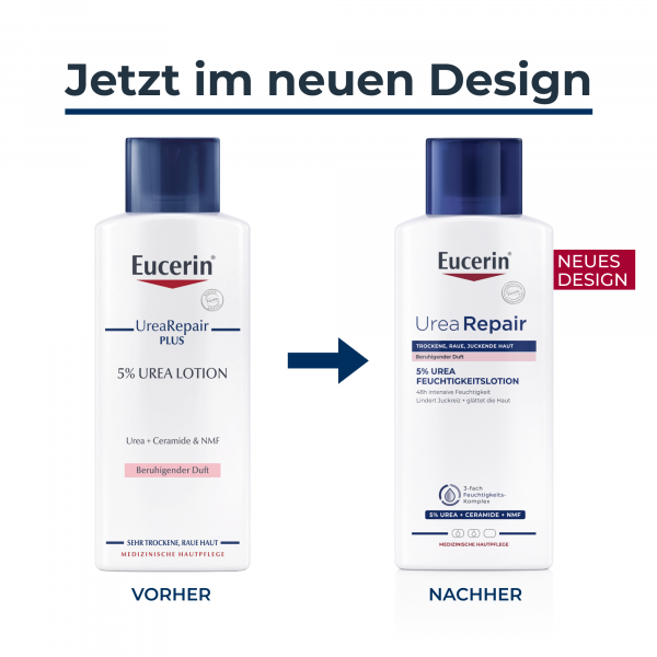 Die Eucerin UreaRepair PLUS Lotion 5% mit beruhigendem Duft ist eine hochwirksame Pflegecreme bei sehr trockener, rauer und gespannter Haut. Mit der Körperlotion wird die Haut 48 Stunden langanhaltend vor Trockenheit geschützt und die Anzeichen trockener Haut werden gelindert. Als Wasser-in-Öl Emulsion zieht die leichte Lotion schnell ein, macht die Haut glatt sowie geschmeidig und stärkt ihre Widerstandskraft.