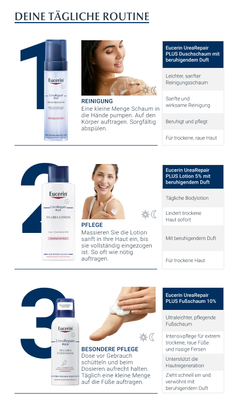 Die Hautcreme enthält den Repair-PLUS-Komplex, der den Wirkstoff Urea mit natürlichen Feuchthaltefaktoren kombiniert. Auf diese Weise wird die Feuchtigkeitsbindung der Haut verbessert und der Feuchtigkeitsgehalt in den oberen Hautschichten deutlich erhöht. Zusätzlich schützen Ceramide die Haut, pflegen sie intensiv und stärken die hauteigene Barriere. Auf diese Weise können Spannungsgefühl, Juckreiz oder eine raue Oberfläche sofort gelindert werden und die Haut wird fühlbar glatt und geschmeidig.