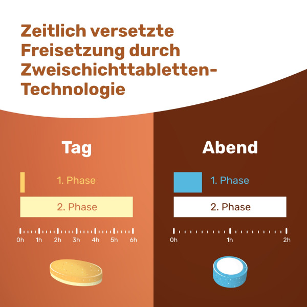 Um im anspruchsvollen Alltag fit zu sein, ist eine ausreichende Nährstoffversorgung wichtig. Nahrungsergänzungsmittel können, als Ergänzung zur täglichen Ernährung, den Körper in seiner Funktion und Leistungsfähigkeit unterstützen. Doch nicht alle Vitamine und Mineralstoffe werden zur gleichen Zeit benötigt, da sich viele körperliche Prozesse an einem 24h-Rhythmus orientieren, wie z.B. der Schlaf-Wach-Rhythmus. Die Muskelaktivität ist z.B. tagsüber höher, wohingegen bestimmte Körperprozesse nachts aktiver sind. Eine sinnvolle Nährstoffversorgung findet im Einklang mit der „inneren Uhr“ statt. EUNOVA® VivaChrono ist auf den 24h-Takt des Körpers abgestimmt – und unterstützt so mit einer speziellen Nährstoffkombination am Tag den Energiestoffwechsel und die Widerstandskraft des Körpers, in der Nacht trägt es zur Erholung und Regeneration bei.1,2,3,4,5 Durch die Kombination aus einer Tablette morgens und einer für den Abend mit durchdachten Tablettentechnologien werden die Nährstoffe bequem und clever koordiniert freigesetzt.