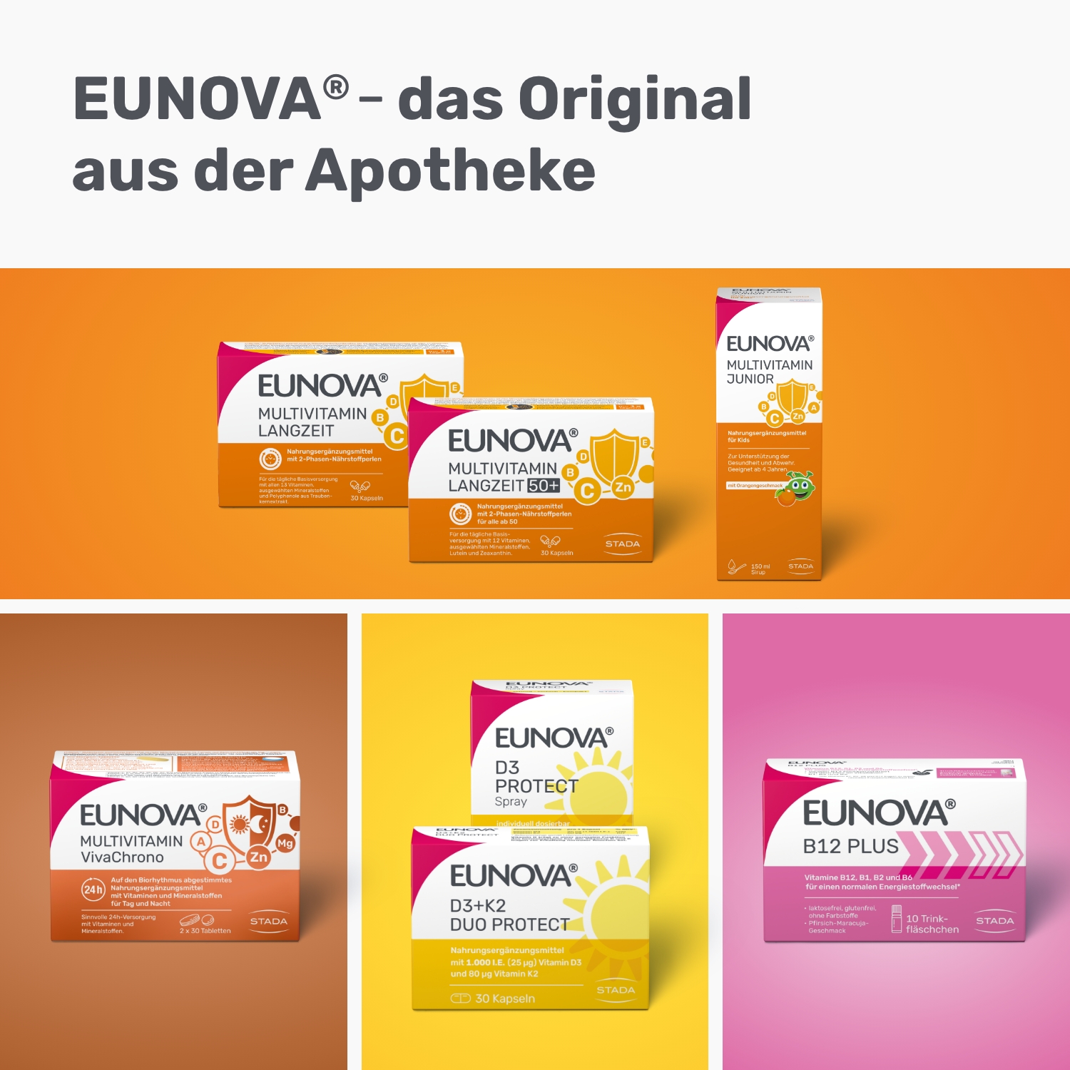 koordiniert werden kann. Zusammengefasst ist EUNOVA® Langzeit das Richtige für die Kunden, die ein Allrounder-Multivitaminprodukt suchen, das nur einmal täglich eingenommen wird. Im Gegensatz dazu ist EUNOVA® VivaChrono ein Premiumprodukt für die bewusste Nahrungsergänzung für Tag und Nacht, die auf den neuesten Erkenntnissen der Nahrungsergänzungsmittelentwicklung beruht.