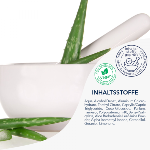 reguliert die Schweißbildung und schützt für 48 Stunden vor unangenehmem Körpergeruch mit dem antibakteriellen Wirkkomplex. Dank seiner milden Rezeptur mit Aloe vera und Lipiden sorgt es zusätzlich für eine sanfte Pflege und angenehme Erfrischung der Haut. Ideal auch für Sportler - Antitranspirante reduzieren die Aktivität der Schweißdrüsen und vermindern dadrurch den Körpergeruch. Alle Inhaltsstoffe werden nach pharmazeutischen Prinzipien kontrolliert.