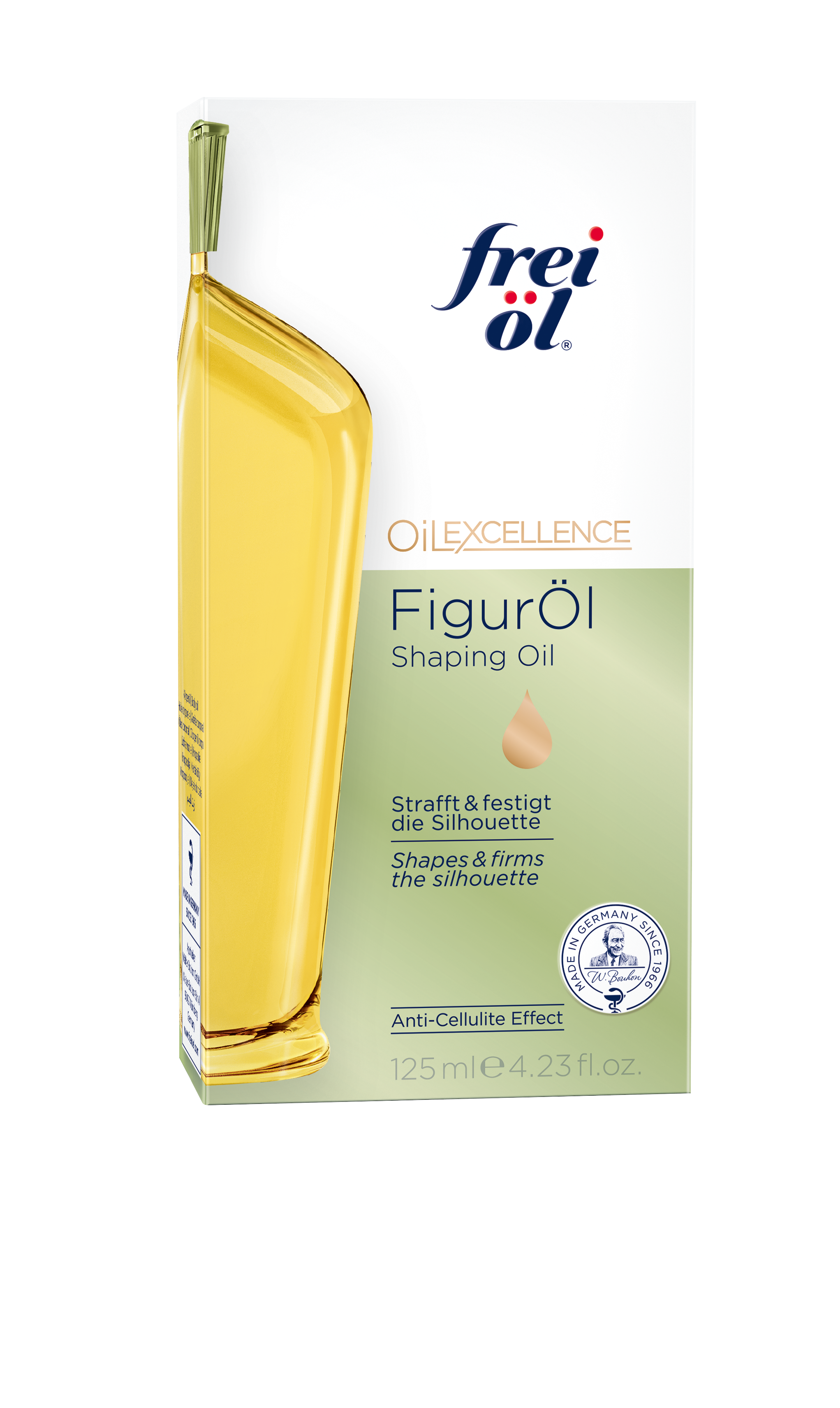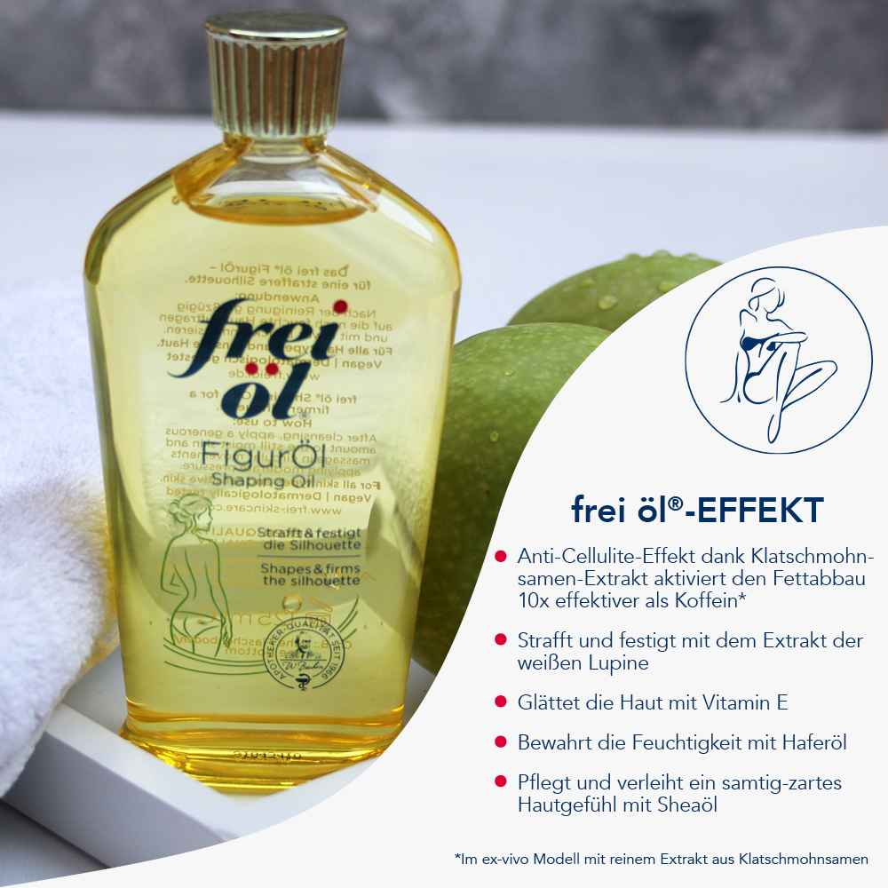 Das leichte, schnell einziehende frei öl® FigurÖl strafft und glättet die Haut. Pflanzliche Öle können besonders tief in die Haut eindringen und verleihen ein geschmeidiges Hautgefühl. Regelmäßig angewendet, kann Cellulite an Bauch, Beinen, Po und Oberarmen wirksam reduziert werden. Mit frischem Zitrusduft.