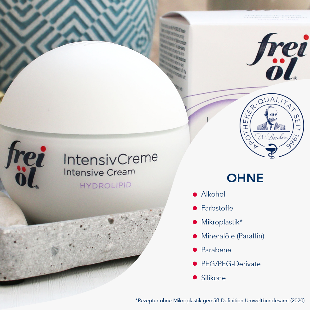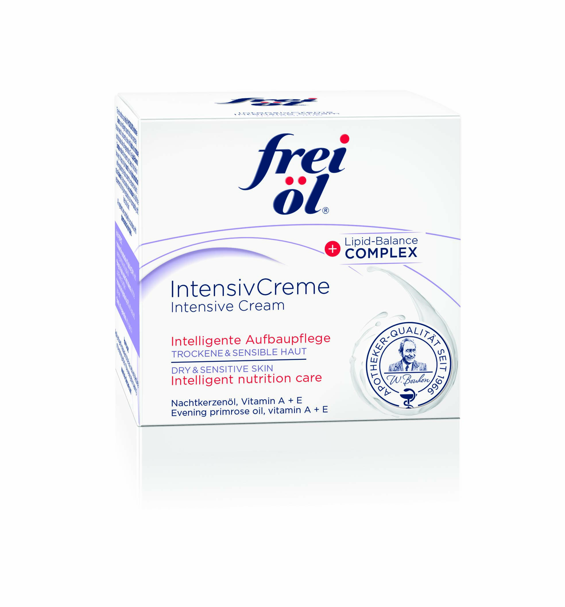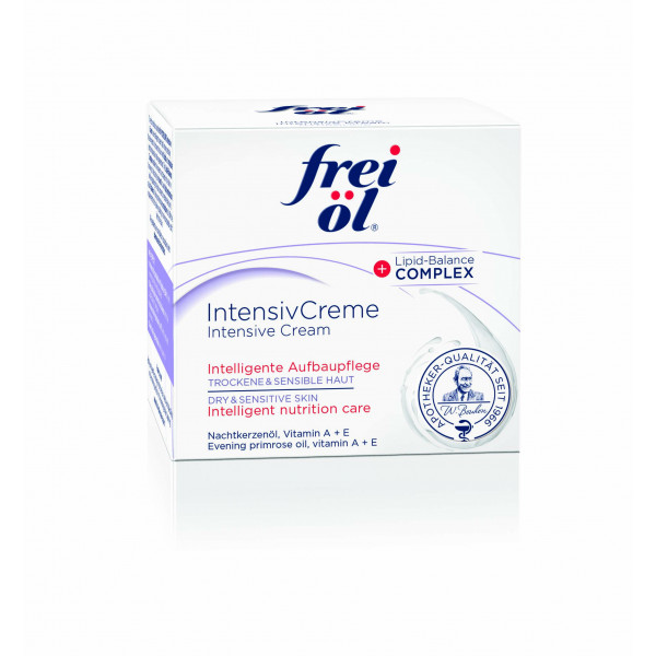 Die reichhaltige Aufbaupflege frei öl® HYDROLIPID IntensivCreme ist eine intelligente Creme, die erkennt, was die Haut braucht. Sie versorgt die Haut mit Lipiden und Feuchtigkeit und unterstützt ihre Zellerneuerung. Mit dem Lipid- Balance-Komplex wirkt sie tief in der Haut auf zweifache Weise: Sie regt trockene Haut an, die eigene Lipid-Produktion zu erhöhen und gleichzeitig reguliert sie den Lipidgehalt so, dass das Gleichgewicht wieder hergestellt wird. Zusätzlich spendet sie Feuchtigkeit und erfüllt somit die Bedürfnisse der trockenen Haut. Das Ergebnis ist ein unvergleichliches Hautgefühl. Alle Inhaltsstoffe werden nach pharmazeutischen Prinzipien kontrolliert.