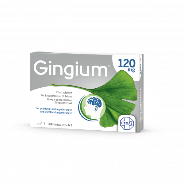 Damit das Gehirn seinen vielfältigen Aufgaben gut nachkommen kann, braucht es ausreichend Nährstoffe und Sauerstoff. Gingium® 120 mg hilft dabei, indem es die Durchblutung im Gehirn fördert und dadurch Gedächtnis und Konzentration verbessert.* Zudem unterstützt Gingium® 120 mg durch die bessere Durchblutung auch die Regeneration des Innenohrs bei Tinnitus**. Der hochwertige Spezialextrakt wird aus den Blättern des Ginkgo-Baumes gewonnen, weist eine hohe Konzen- tration natürlicher Wirkstoffe (Ginkgoflavonglykoside, Terpenlactone) auf und ist gut verträglich.