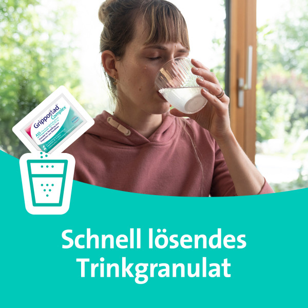 Es wird angewendet zur Behandlung von Schleimhautschwellung der Nase und Nasennebenhöhlen bei Schnupfen mit einhergehenden, erkältungsbe- dingten Schmerzen und Fieber in Folge eines grippalen Infekts. Das Trink- granulat enthält pro Beutel 500 mg Acetylsalicylsäure und 30 mg Pseudo- ephedrinhydrochlorid. Grippostad Complex ermöglicht schnell wieder frei durchzuatmen und hat keine dämpfende Wirkung - man bleibt wach und aktiv trotz Erkältung.