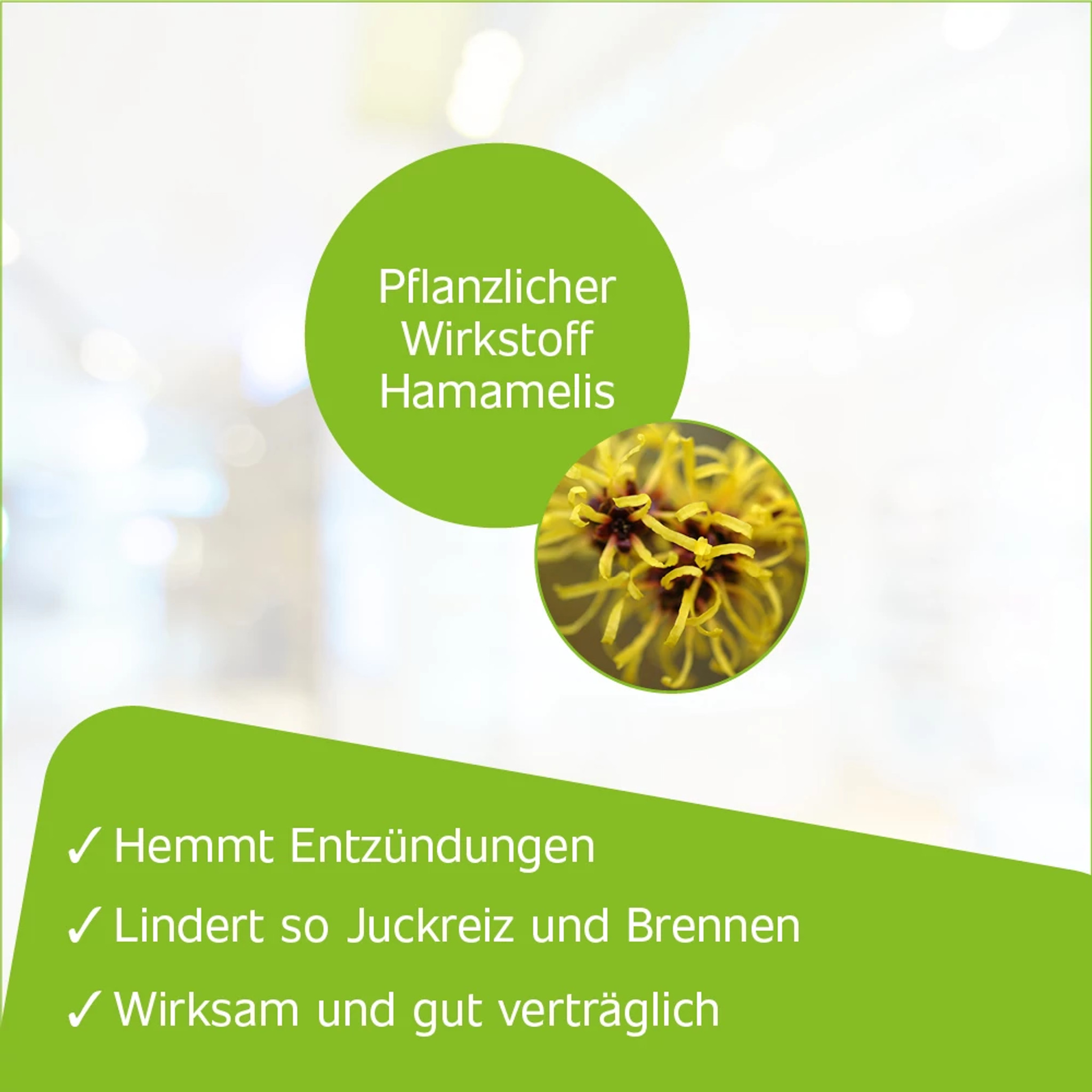 Wirkstoff: Hamamelisblätter-Auszug. Anwendungsgebiete: zur Linderung von Beschwerden wie Juckreiz, Brennen, leichte Blutungen in den Anfangsstadien von Hämorrhoidalleiden.
