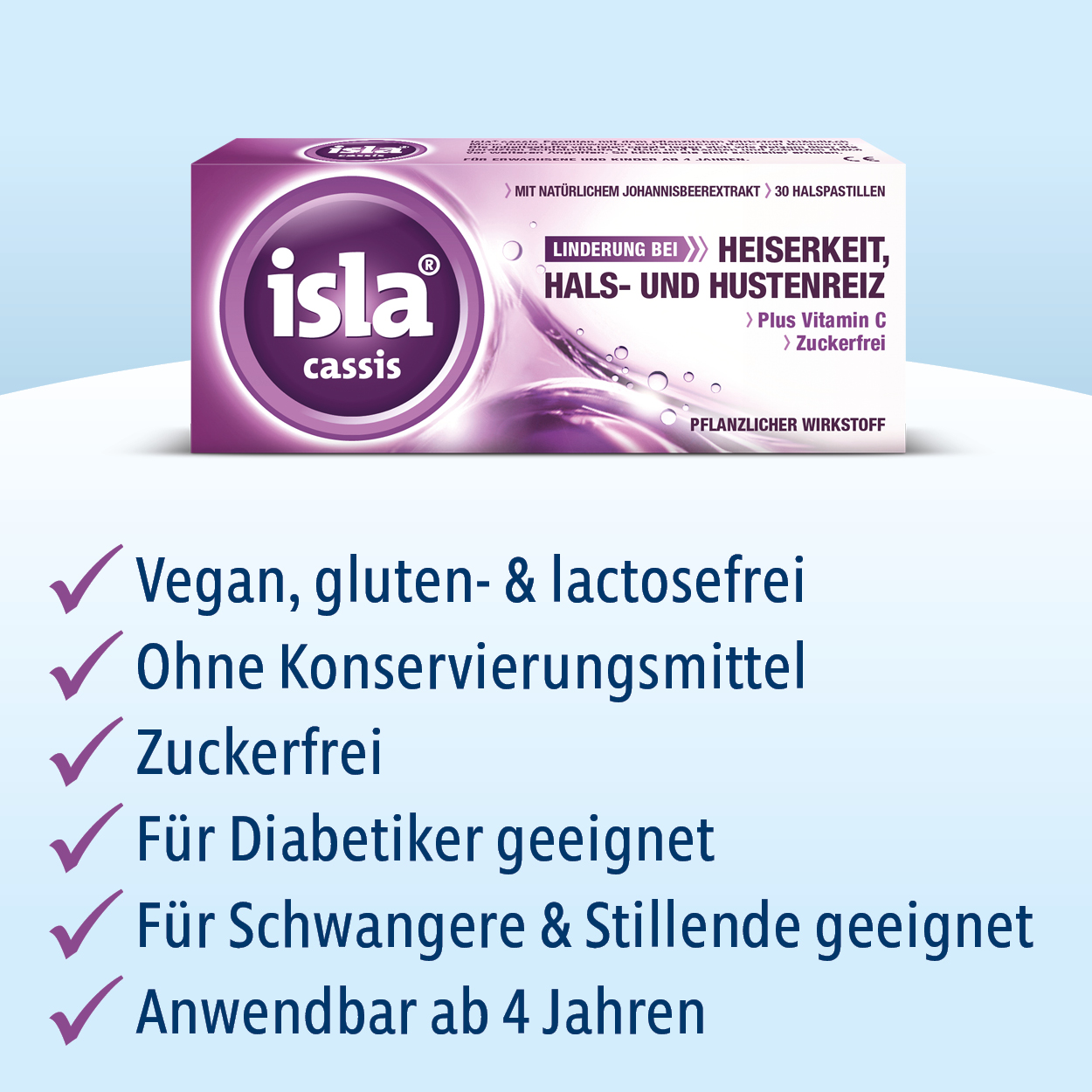 Die Inhaltsstoffe von isla® cassis legen sich wie Balsam über die Schleimhaut in Hals und Rachen. So wird die gereizte Schleimhaut vor weiteren Angriffen geschützt und kann sich durch die wohltuende Wirkung schneller erholen, insbesondere bei Beschwerden im Hals durch•Hustenreiz und Heiserkeit•starke Beanspruchung der Stimmbänder (Sänger,Redner)•trockene Atemluft (geheizt oder klimatisiert)•Mundtrockenheit•eingeschränkte Nasenatmung.