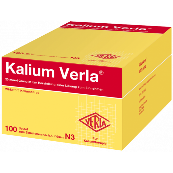 Kalium Verla® bewährt sich seit vielen Jahren als Arzneimittel mit höchsten Qualitätsstandards in der Therapie von Kaliummangelzuständen. Das hochwertige Pulver schmeckt erfrischend nach Citrus und kann einfach mit Wasser angerührt werden. So wird auch die tägliche Flüssigkeitsaufnahme unterstützt. Das aufgelöste Pulver ist außerdem nicht brausend, eine gute Alternative für alle, die Brausetabletten als unangenehm empfinden. Durch die moderate Dosierung von Kalium Verla® ist es individuell gut dosierbar und kann ganz nach Bedarf über den Tag verteilt getrunken werden. Kalium Verla® enthält ausschließlich organisches Kaliumcitrat, welches besser verträglich ist als Kaliumchlorid.