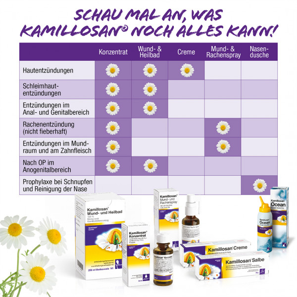 Kamillosan Salbe. Wirkstoff: Kamillenblüten-Trockenextrakt. Anwendungsgebiete: bei Haut- und Schleimhautentzündungen. Die Salbe ist auch für die Anwendung im Anal- und Genitalbereich geeignet, einschließlich für die Behandlung von Hämorrhoiden.