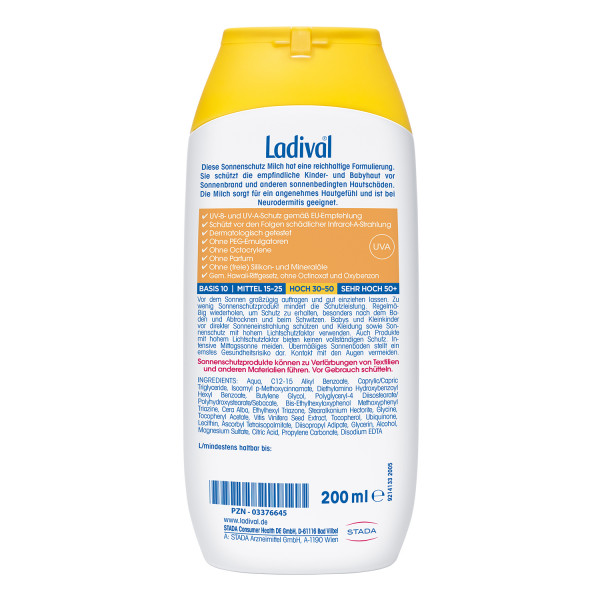 Ladival® Für Kinder Sonnenschutz Milch wurde speziell für die besonderen Bedürfnisse der Kinderhaut entwickelt und ist auch zur Anwendung bei Neurodermitis geeignet. Die sehr reichhaltige Kinder Sonnenmilch pflegt intensiv. Die Flasche kann auf dem Kopf stehen – für eine vollständige Restentleerbarkeit.