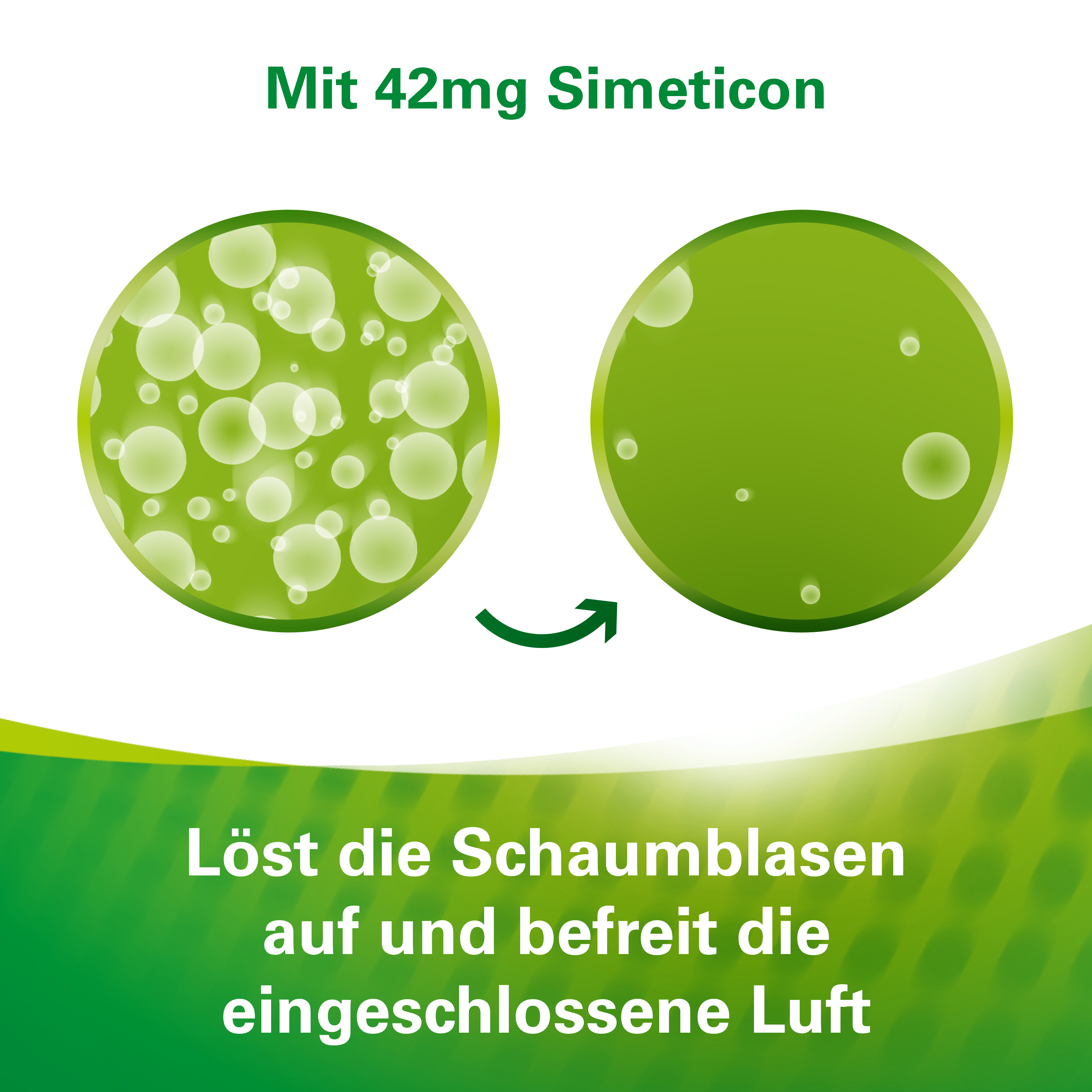 Der Wirkstoff hilft gegen Blähungen. Diese werden durch aufgestaute Gase im Magen-Darm-Trakt verursacht, die in Form eines feinen Schaums vorliegen. Der Wirkstoff fördert den Abgang der Gase, indem er diesen Schaum zerstört.