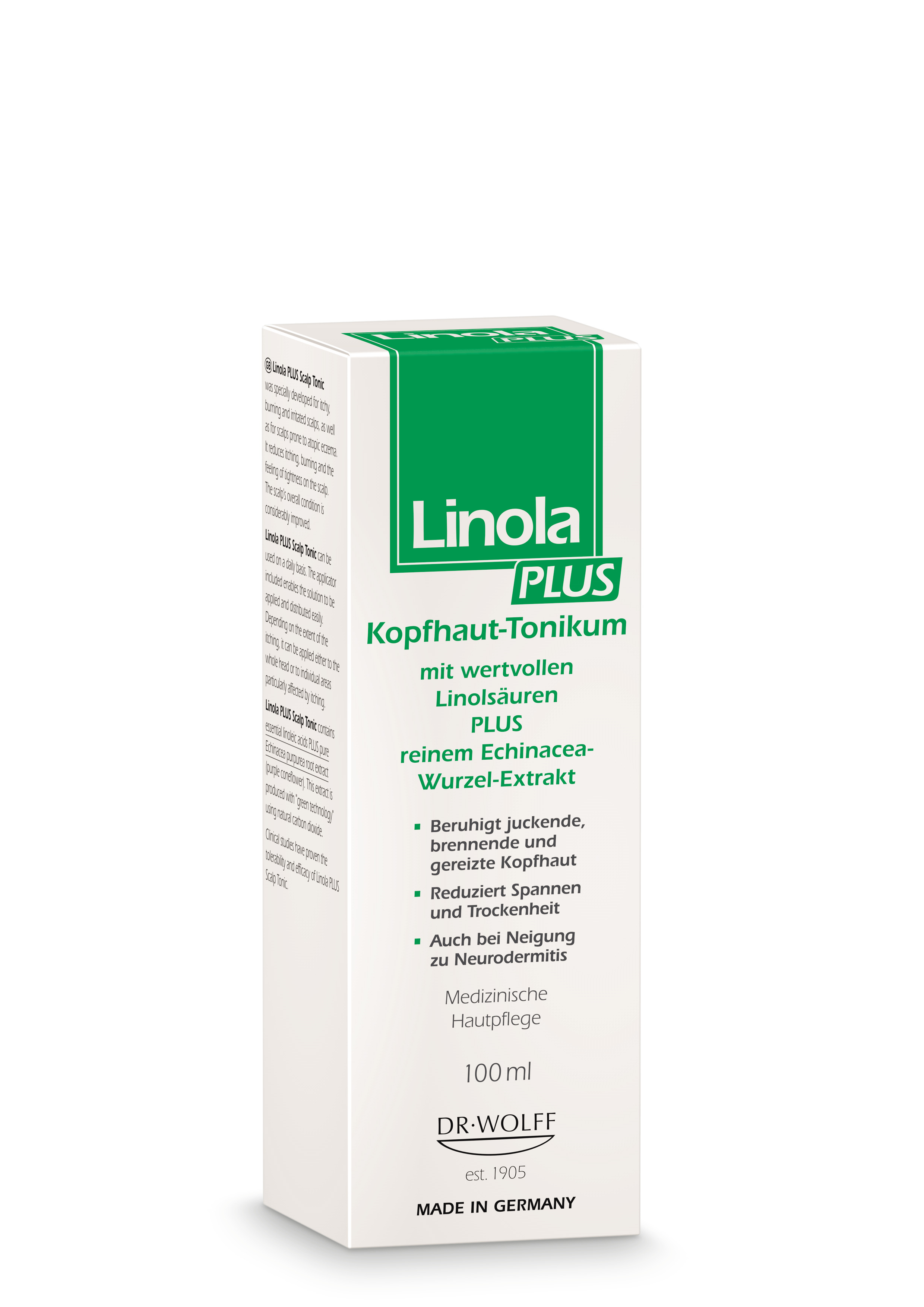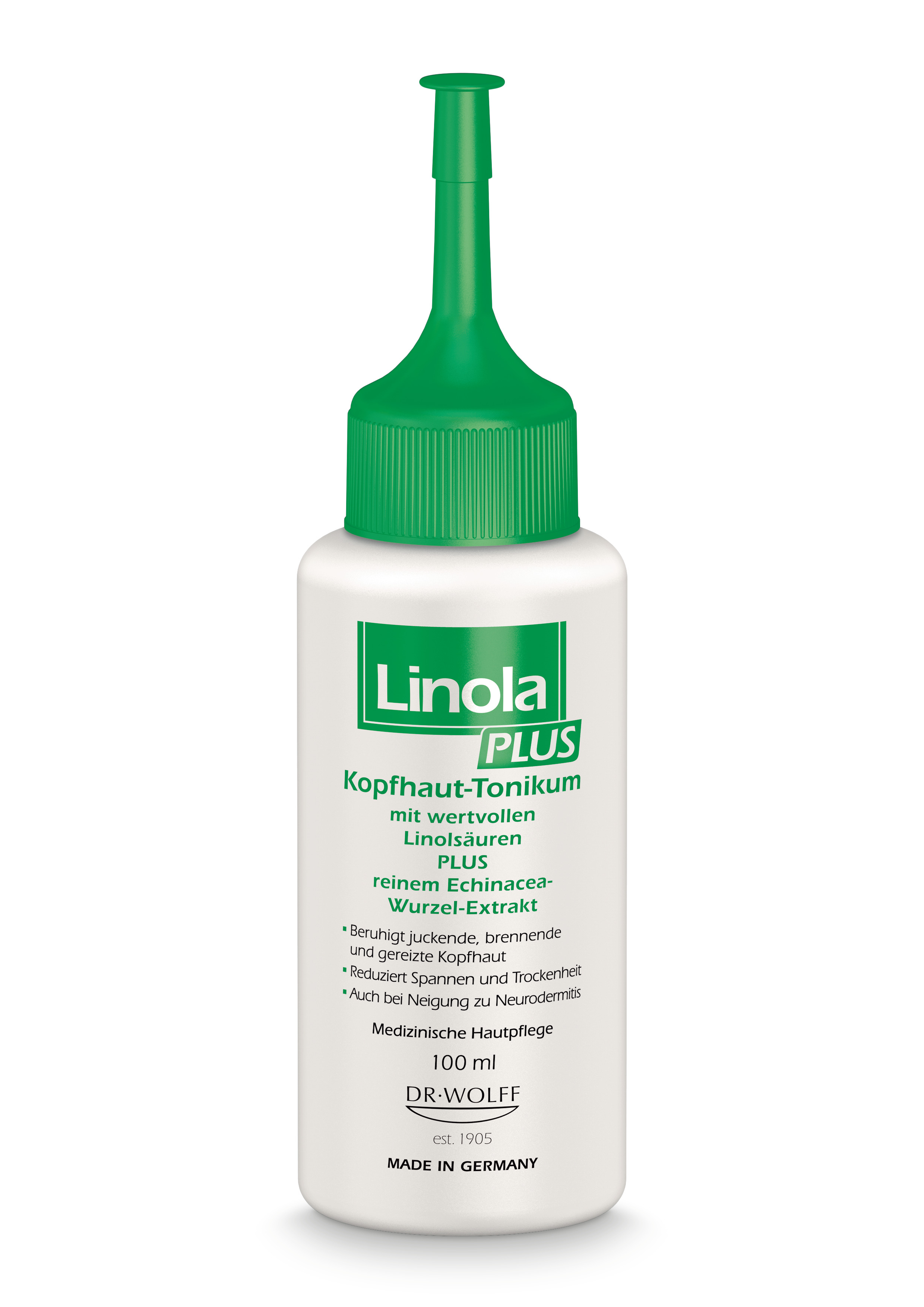 Linola PLUS Kopfhaut-Tonikum ist abgestimmt auf die speziellen Pflege-Bedürfnisse juckender, brennender, gereizter sowie zu Neurodermitis neigender Kopfhaut. Es reduziert den Juckreiz, das Brennen sowie das Spannungsgefühl auf der Kopfhaut. Linola PLUS Kopfhaut-Tonikum kann täglich angewendet werden. Je nach Ausprägung des Juckreizes kann es sowohl am ganzen Kopf oder auf einzelnen, von Juckreiz besonders betroffenen Stellen aufgetragen werden. Dank eines Applikators lässt sich das Kopfhaut-Tonikum leicht auftragen und verteilen. Linola PLUS Kopfhaut-Tonikum zeichnet sich durch seine einzigartige Formulierung aus wertvollem Linolsäure-reichen Distelöl sowie einem besonderen Pflanzenextrakt aus der Wurzel der Echinacea purpurea (Purpur-Sonnenhut) aus.