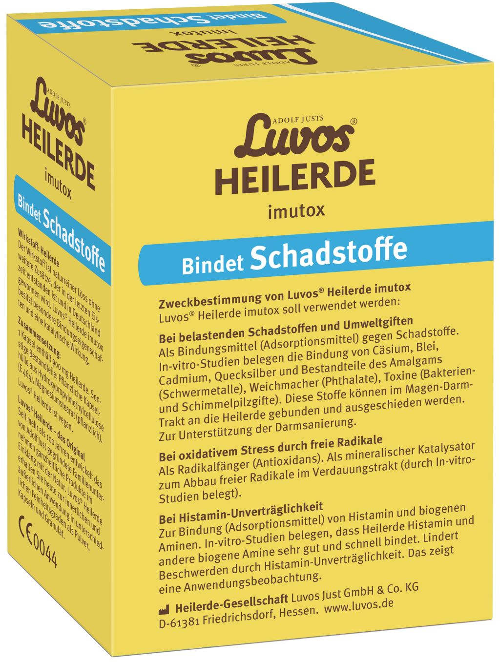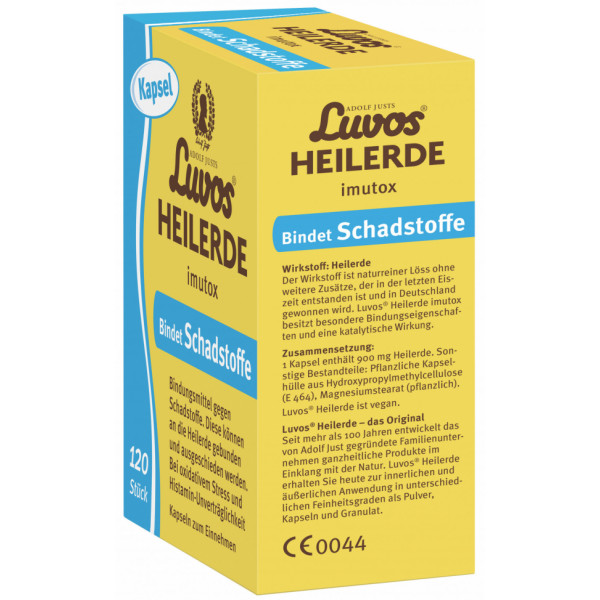 Adolf Justs Luvos® Heilerde imutox Pulver ist ein Medizinprodukt, das zur Unterstützung des Organismus bei der Körperentgiftung, Darmsanierung, Entschlackung sowie Entlastung der Leber und Niere durch Bindung von Schadstoffen und Umweltgiften aus der Nahrung verwendet wird. Beispielsweise werden gebunden: belastende Substanzen (radioaktives Cäsium), Schwermetalle (Blei, Cadmium, Quecksilber und Bestandteile des Amalgams), Weichmacher (Phthalate), Toxine (Bakterien- und Schimmelpilzgifte).