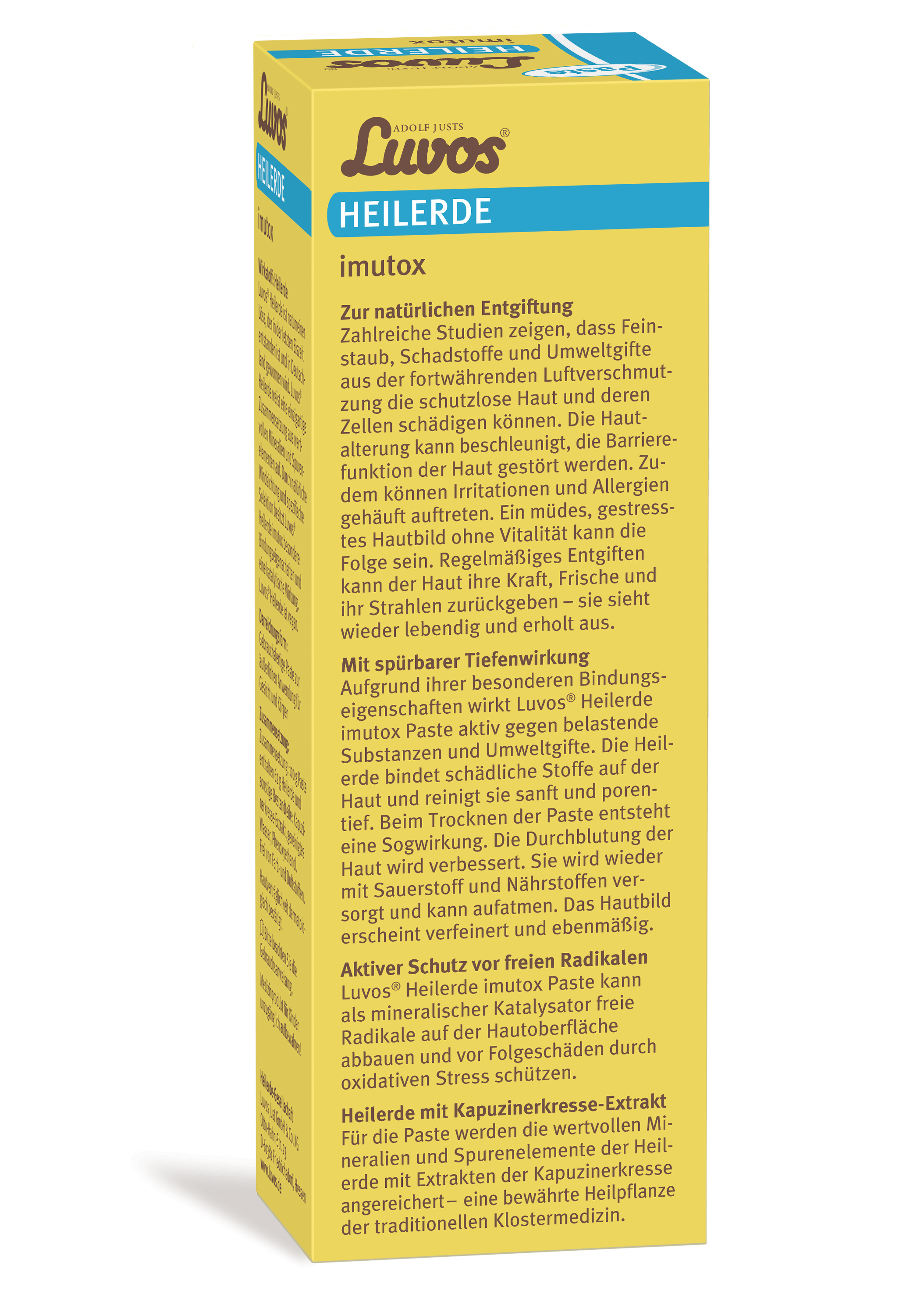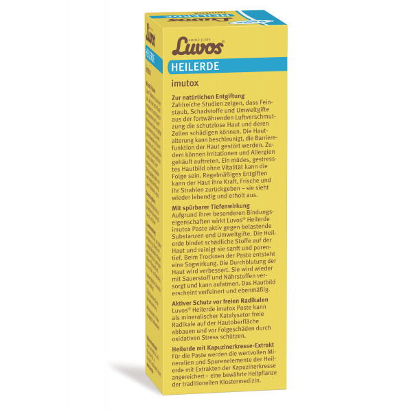 Luvos® Heilerde imutox Paste wird äußerlich für Gesicht und Körper angewendet zur Unterstützung der Haut bei der Entgiftung und Bindung von Schadstoffen und Umweltgiften auf der Haut. Als mineralischer Katalysator zum Abbau freier Radikale auf der Haut, um vor Folgeschäden durch oxidativen Stress zu schützen. Zur Verbesserung der Durchblutung.