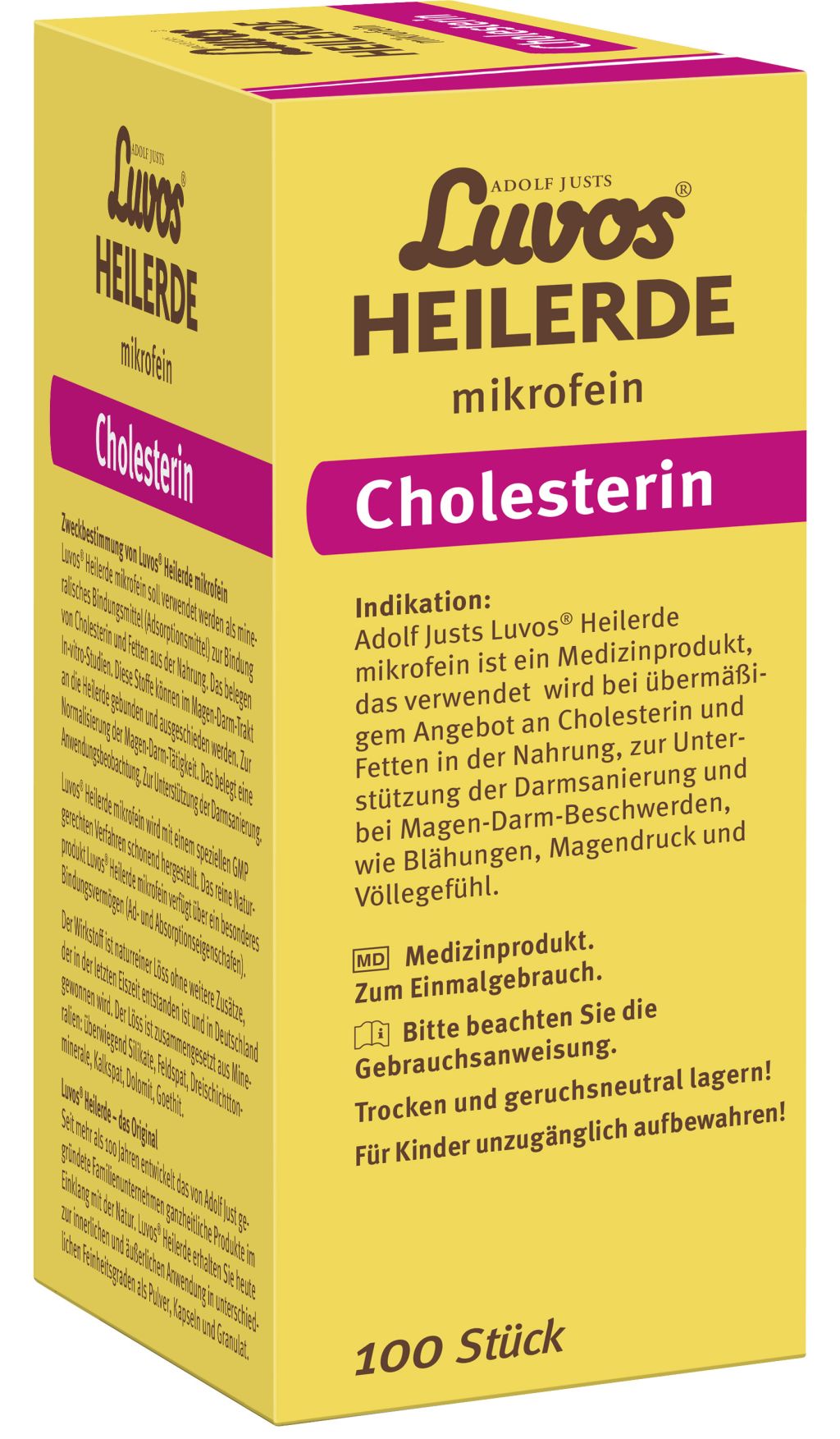 Adolf Justs Luvos® Heilerde mikrofein Pulver ist ein Medizinprodukt, das als mineralisches Magen-Darm-Mittel zur Bindung von Cholesterin und Fetten aus der Nahrung, zur Unterstützung der Darmsanierung und Entschlackung sowie  zur Linderung von Magen-Darm-Beschwerden, verbunden mit Blähungen, Magendruck und Völlegefühl verwendet wird.