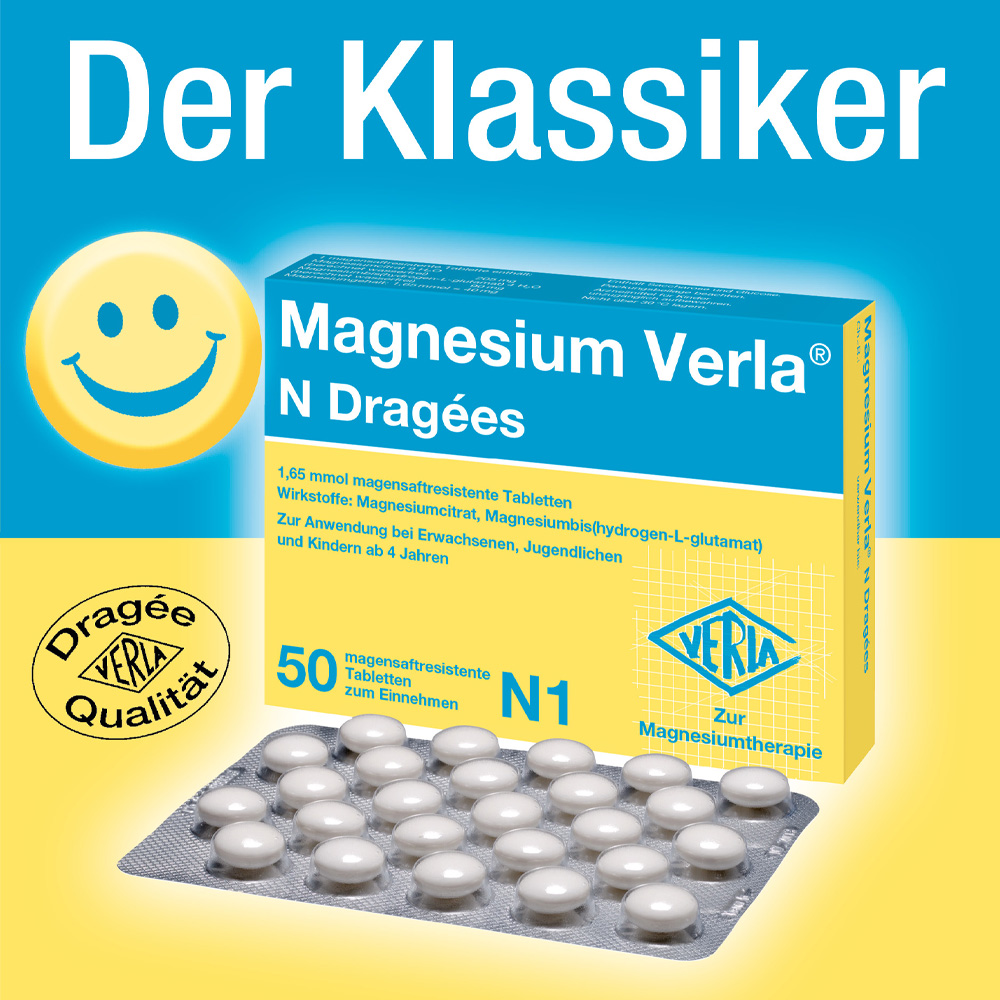 Seit mehr als 65 Jahren bewähren sich Magnesium Verla® N Dragées als Arzneimittel mit höchsten Qualitätsstandards in der Therapie von Magnesiummangelzuständen. Magnesium wird am besten vom Körper aufgenommen, wenn kleinere Mengen über den Tag verteilt eingenommen werden. Durch die niedrige Dosierung von Magnesium Verla® N Dragées sind sie individuell gut dosierbar und können ganz nach Bedarf zu verschiedenen Tageszeiten eingenommen werden. Sie haben einen leckeren Geschmack nach Vanille und lassen sich sehr leicht schlucken. Die magensaftresistenten Dragées sind außerdem gut verträglich. Zusätzlich werden in Magnesium Verla® N Dragées ausschließlich organische Magnesiumverbindungen für eine gute Aufnahme und Bioverfügbarkeit im Körper verwendet.