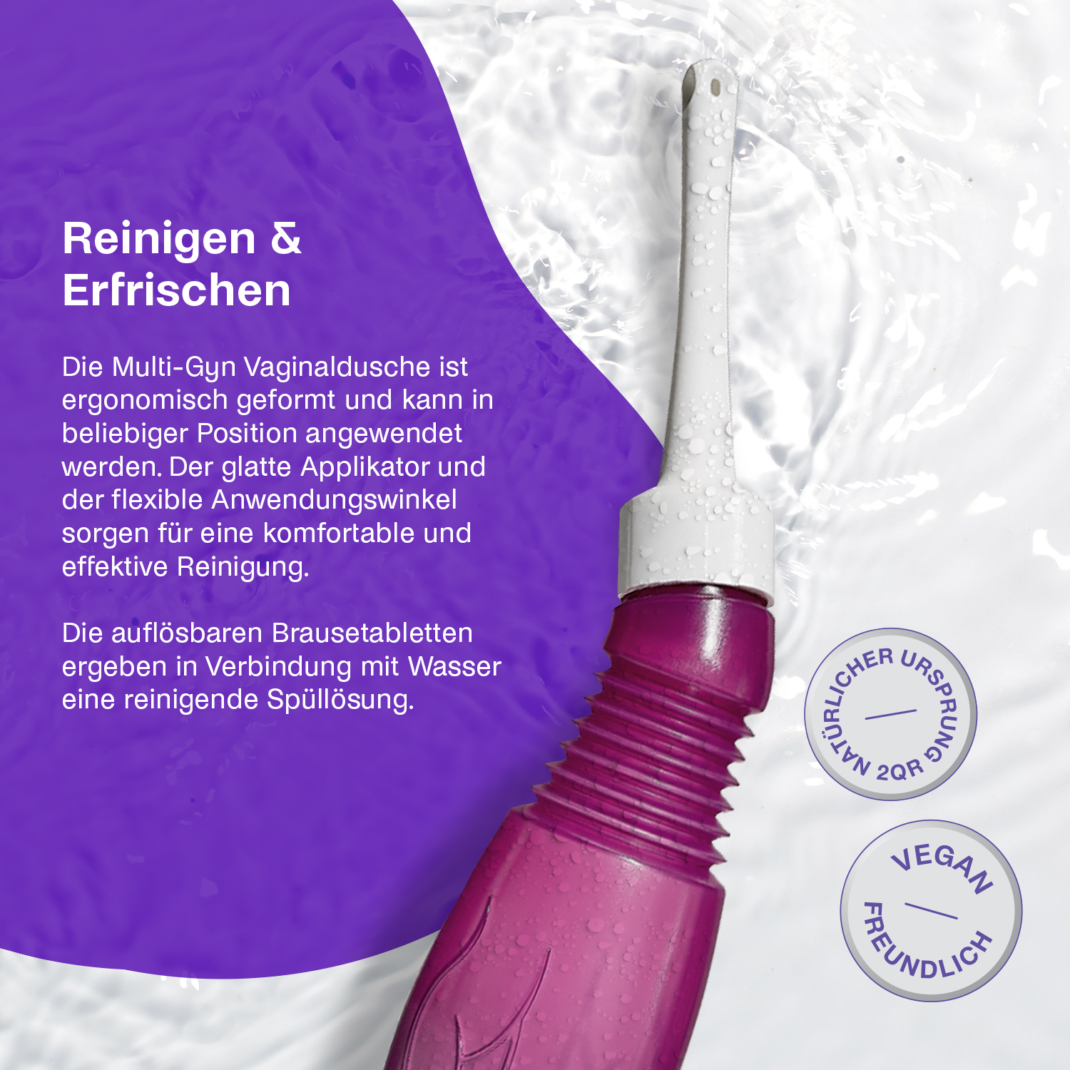 Die Vaginaldusche und Brausetabletten von Multi-Gyn eignen sich ideal für die tägliche Vaginalhygiene. Dazu zählt auch, die Scheide bei übermäßigem oder schlecht riechendem Ausfluss, Juckreiz, Hautreizung und Brennen schonend zu reinigen. Auch zur Therapievorbereitung (z.B. vor Einbringen von Vaginalgelen) kann die Multi-Gyn Vaginaldusche eingesetzt werden. Sie beseitigt abgestorbenes Gewebe und bereitet so die Scheide für die effiziente Behandlung von Scheideninfektionen vor.