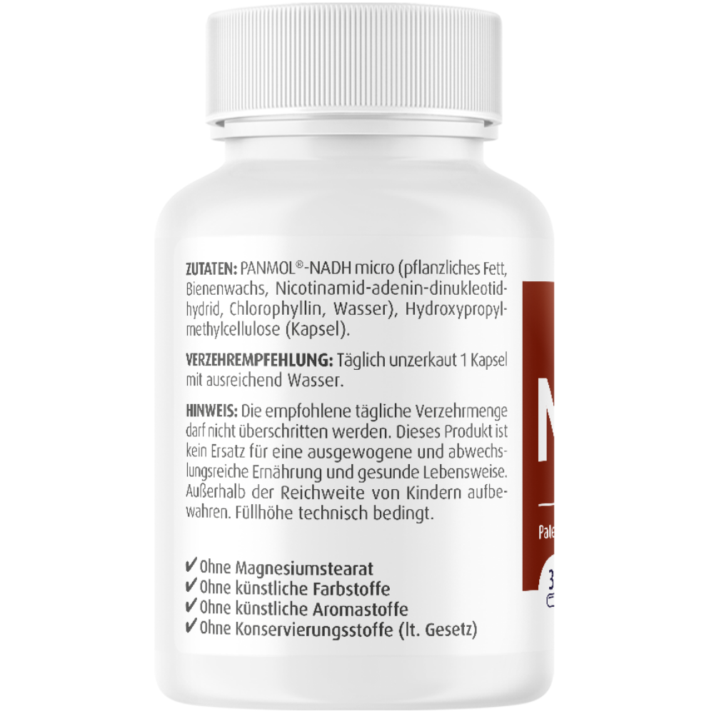 PANMOL®-NADH micro (pflanzliches Fett, Bienenwachs, Nicotinamid-adenin-dinukleotidhydrid, Chlorophyllin, Wasser), Hydroxypropylmethylcellulose (Kapsel).