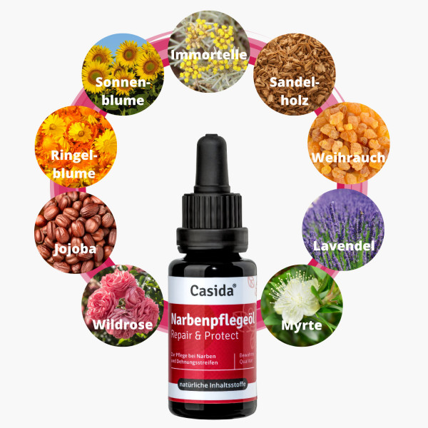 - Die ätherischen Öle wirken zellregenerierend und verbessern die Gewebestruktur. Narben werden unauffälliger.