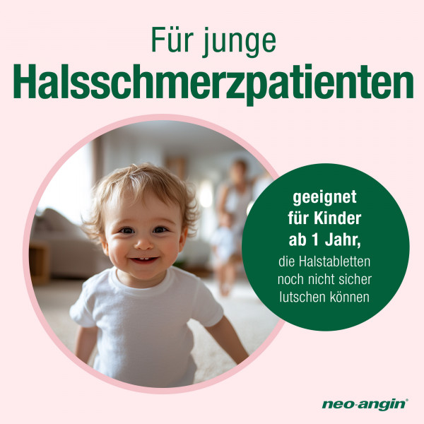 Alle neo-angin® Produkte sind für Kinder ab 6 Jahren geeignet. Für Kleinkinder ab 1 Jahr, oder Kinder die noch nicht sicher lutschen können, gibt es den neo-angin® junior Halsschmerzsaft.