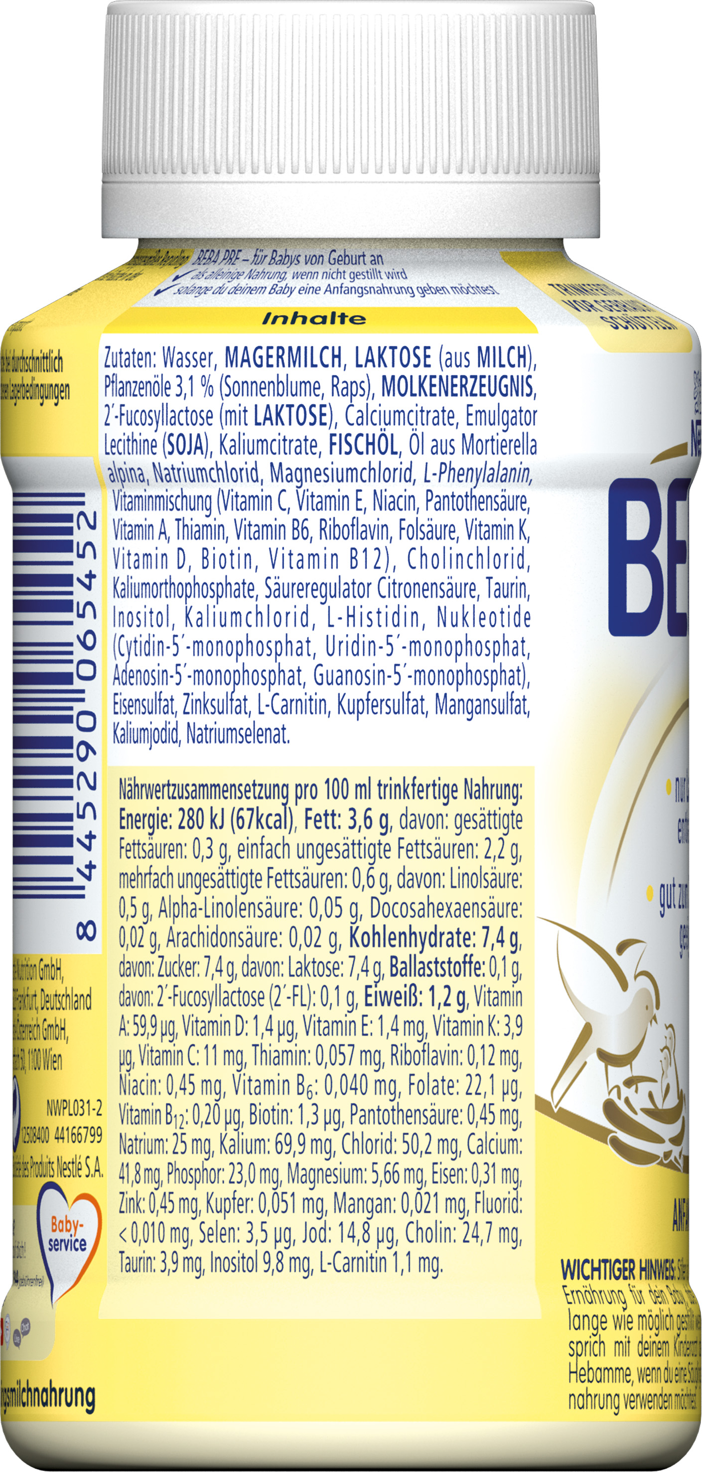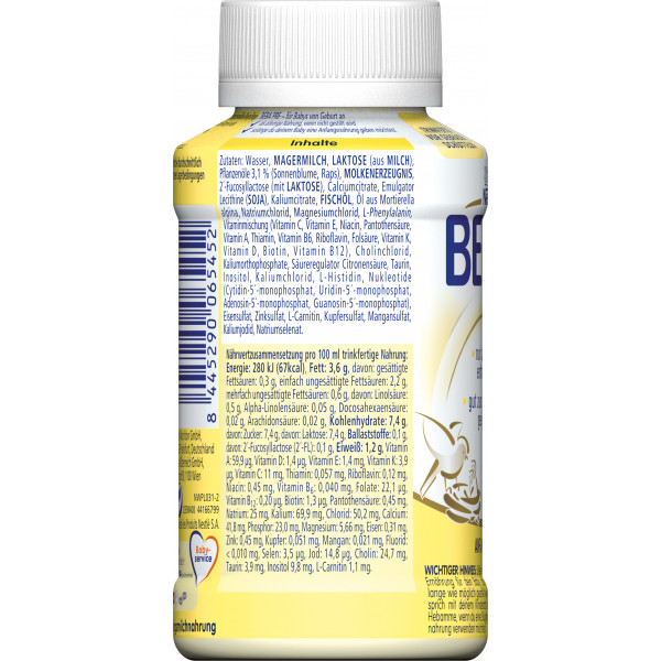 Wasser, Magermilch, Laktose (aus Milch), Pflanzenöle 2,9% (Sonnenblume, Raps), Molkenerzeugnis, Kokosfett, 2´-Fucosyllactose, Calciumcitrate, Emulgator Lecithine (Soja), Kaliumcitrate, Fischöl, Öl aus Mortierella alpina, Natriumchlorid, Magnesiumchlorid, L-Phenylalanin, Vitaminmischung (Vitamin C, Vitamin E, Niacin, Pantothensäure, Vitamin A, Thiamin, Vitamin B6, Riboflavin, Folsäure, Vitamin K, Vitamin D, Biotin, Vitamin B12), Cholinchlorid, Kaliumorthophosphate, Säureregulator Citronensäure, Taurin, Inositol, Kaliumchlorid, L-Histidin, Nukleotide (Cytidin-5´-monophosphat, Uridin-5´-monophosphat, Adenosin-5´-monophosphat, Guanosin-5´-monophosphat), Eisensulfat, Zinksulfat, L-Carnitin, Kupfersulfat, Mangansulfat, Kaliumjodid, Natriumselenat.