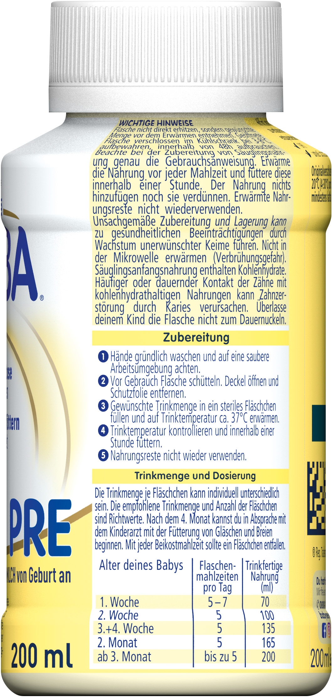 Flasche nicht direkt erhitzen, sondern gewünschte Menge vor dem Erwärmen entnehmen. Beachten Sie bei der Zubereitung von Säuglingsnahrung genau die Gebrauchsanweisung. Erwärmen Sie die Nahrung vor jeder Mahlzeit und füttern Sie diese innerhalb einer Stunde. Der Nahrung nichts hinzufügen noch sie verdünnen. Erwärmte Nahrungsreste nicht wiederverwenden. Unsachgemäße Zubereitung und Lagerung kann zu gesundheitlichen Beeinträchtigungen durch Wachstum unerwünschter Keime führen. Nicht in der Mikrowelle erwärmen (Verbrühungsgefahr). Säuglingsanfangsnahrungen enthalten Kohlenhydrate. Häufiger oder dauernder Kontakt der Zähne mit kohlenhydrathaltigen Nahrungen kann Zahnzerstörung durch Karies verursachen. Überlassen Sie Ihrem Kind die Flasche nicht zum Dauernuckeln.