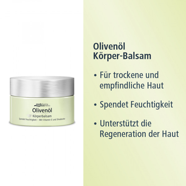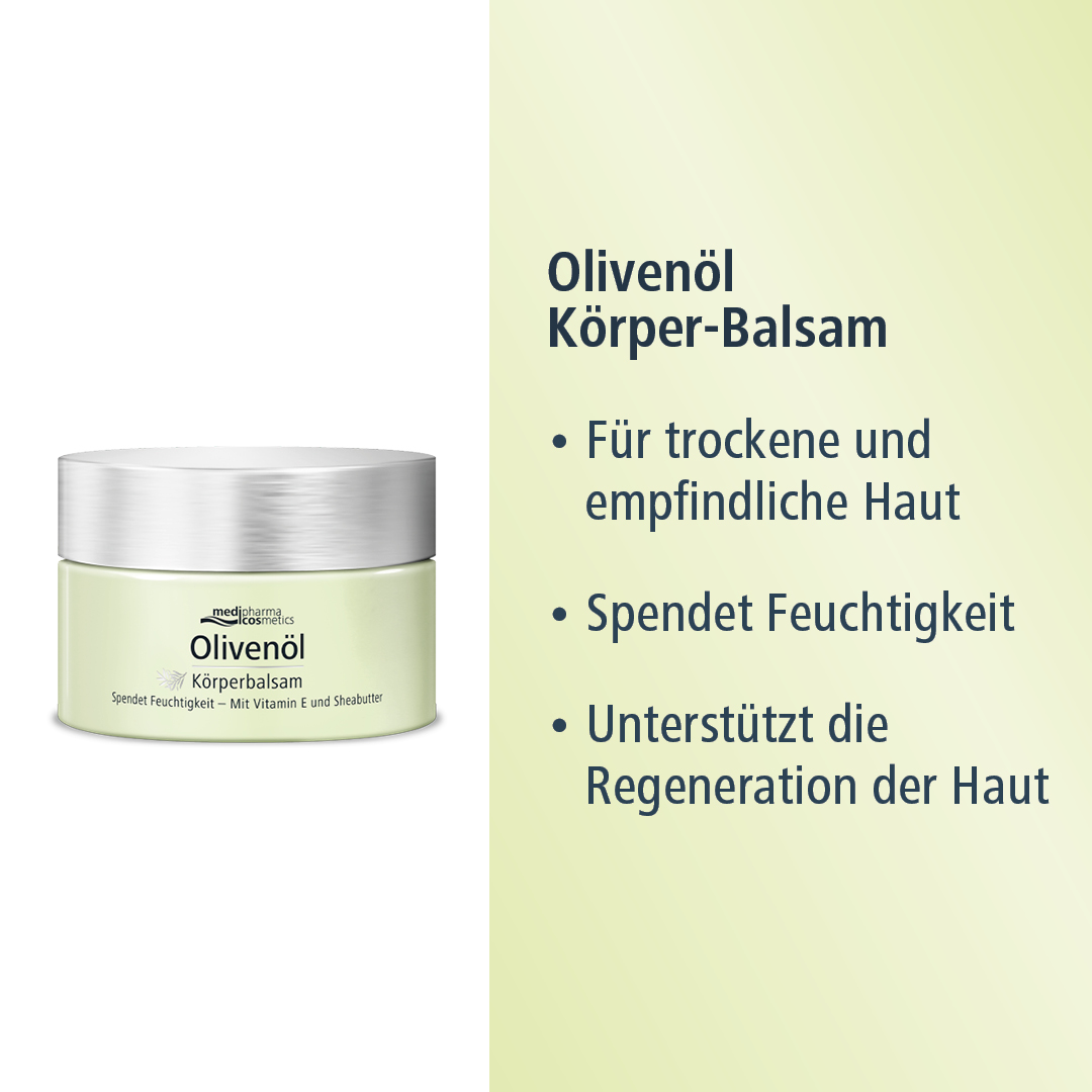 Ein kaltgepresstes Olivenöl, kultiviert und produziert unter den optimalen Bedingungen des mediterranen Klimas. Daraus haben wir unseren Olivenöl Körper-Balsam entwickelt, der trockene und empfindliche Haut mit ausreichend Feuchtigkeit versorgt.