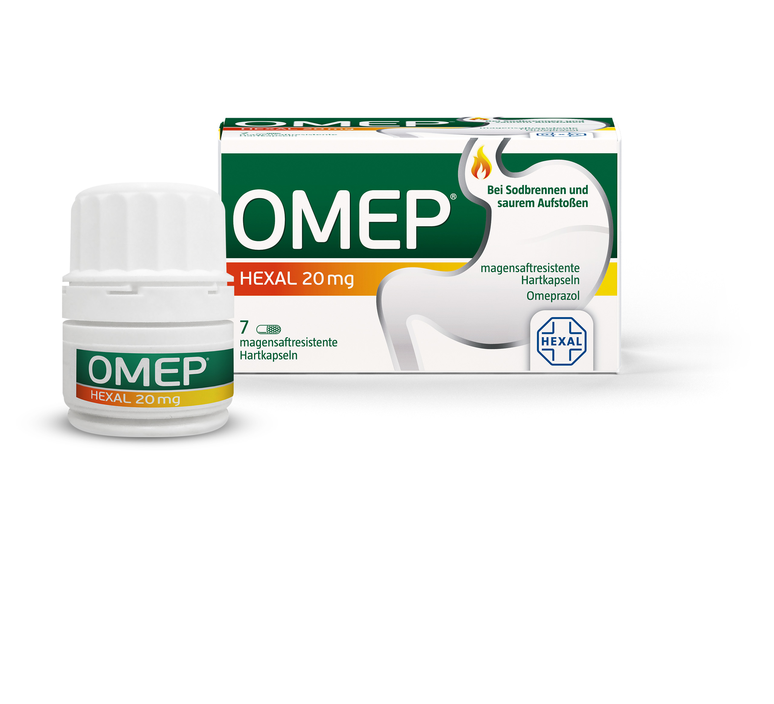 OMEP® HEXAL 20 mg, magensaftresistente Hartkapseln : Wirkstoff: Omeprazol. Anwendungsgeb.: kurzzeitige Behandlung von Refluxbeschwerden (z. B. Sodbrennen, Säurerückfluss) bei Erwachsenen. Enthält