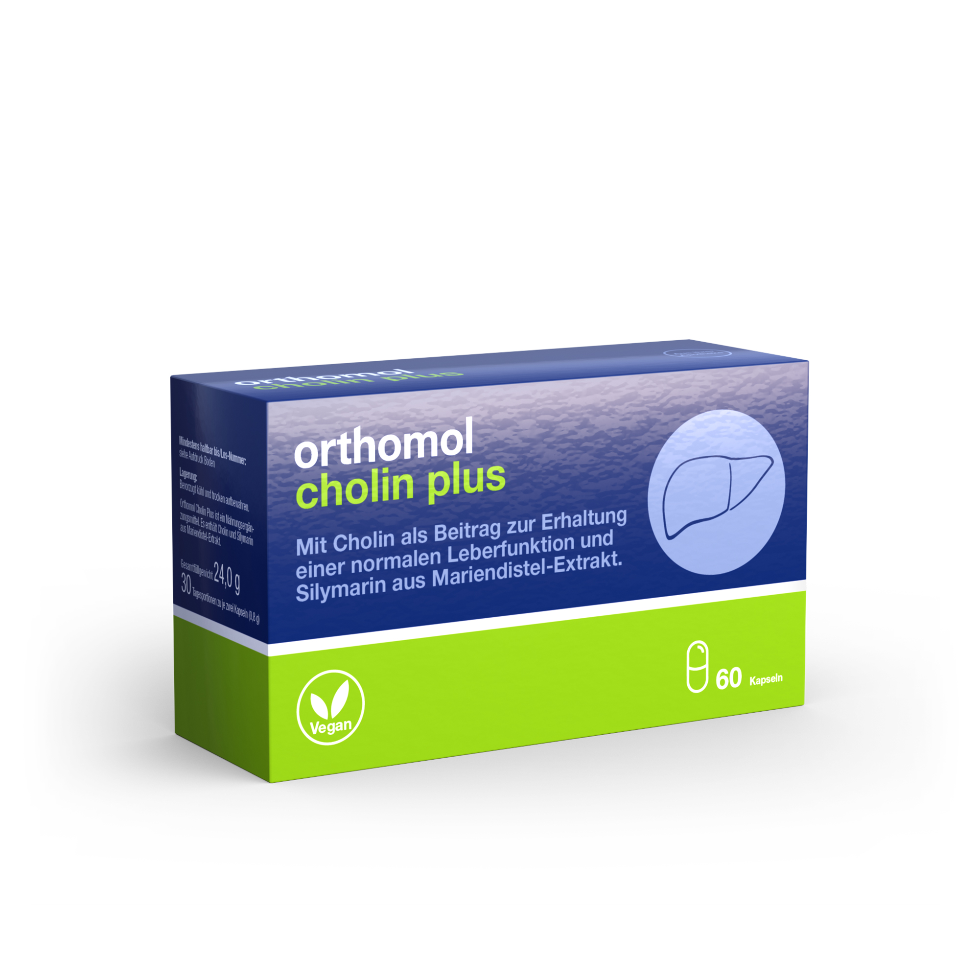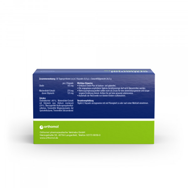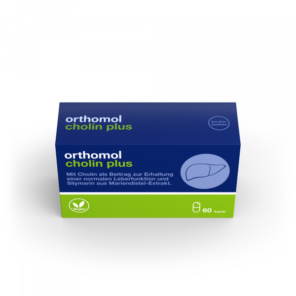 • Orthomol Cholin Plus ist ein Nahrungsergänzungsmittel. Es enthält Cholin als Beitrag zur Erhaltung einer normalen Leberfunktion und Silymarin aus Mariendistel-Extrakt.