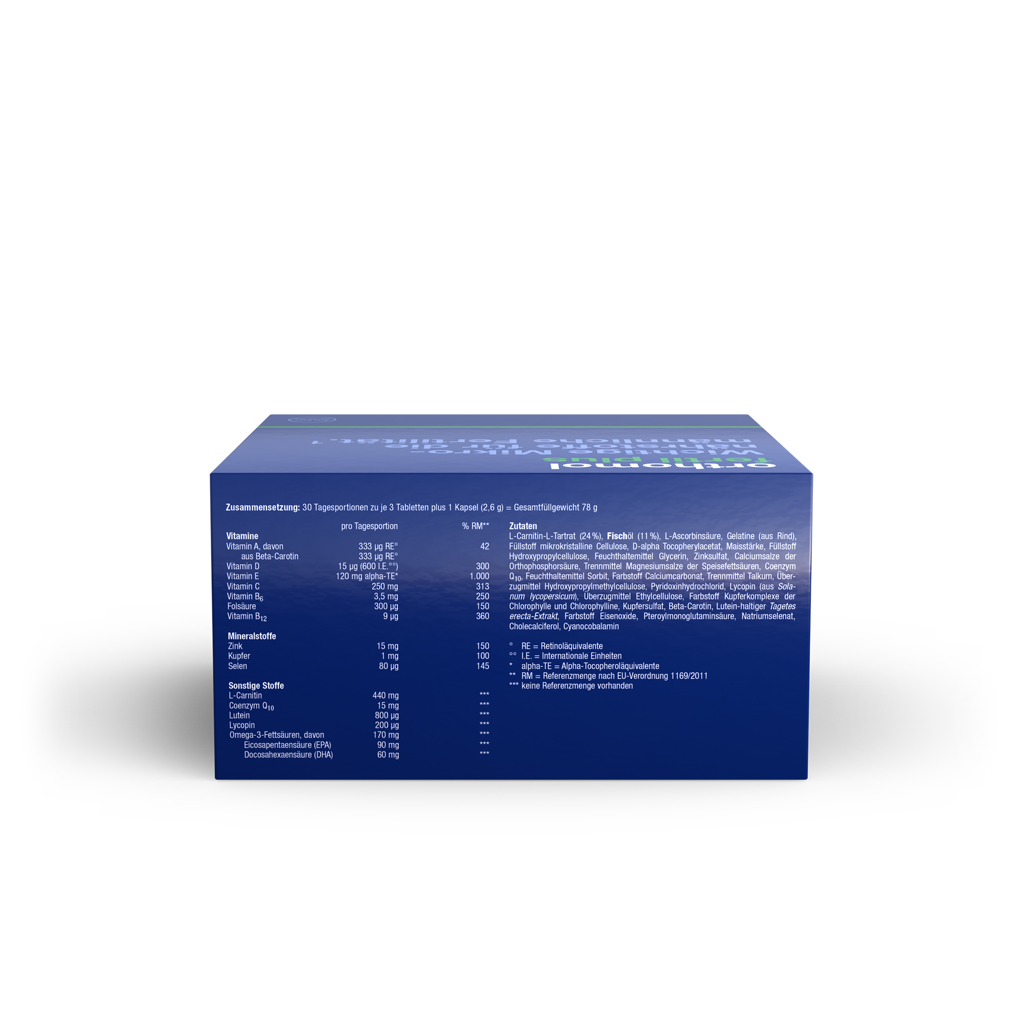 L-Carnitin-L-Tartrat (22 %), Füllstoff mikrokristalline Cellulose, Feuchthaltemittel Sorbit, Fischöl (11 %), L-Ascorbinsäure, Gelatine (aus Rind), Füllstoff Hydroxypropylcellulose, Maisstärke, Feuchthaltemittel Glycerin, D-alpha Tocopherylacetat, Überzugmittel Hydroxypropylmethylcellulose, Zinksulfat, Trennmittel Magnesiumsalze der Speisefettsäuren, Coenzym Q10, Trennmittel Talkum, Farbstoff Titandioxid, Pyridoxinhydrochlorid, Kupfersulfat, Lycopin (aus Solanum lycopersicum), Farbstoff Kupferkomplexe der Chlorophylle und Chlorophylline, Beta-Carotin, Lutein-haltiger Tagetes erecta-Extrakt, Überzugmittel Ethylcellulose, Farbstoff Eisenoxide, Pteroylmonoglutaminsäure, Antioxidationsmittel stark tocopherolhaltige Extrakte, Stabilisator Mono- und Diglyceride von Speisefettsäuren, Natriumselenat, Cholecalciferol, Cyanocobalamin.