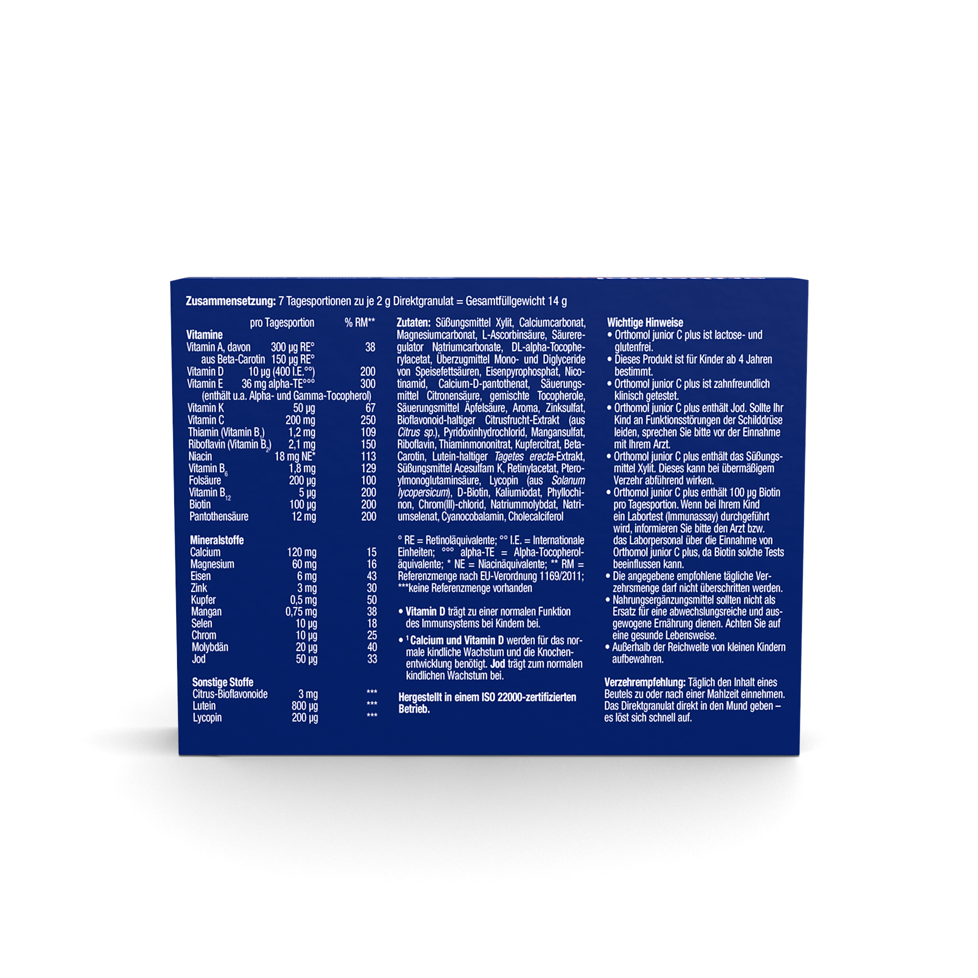 Orthomol junior C plus ist ein Nahrungsergänzungsmittel für Kinder. Mit Vitamin D als Beitrag zu einer normalen Funktion des Immunsystems bei Kindern und mit weiteren Mikronährstoffen1.