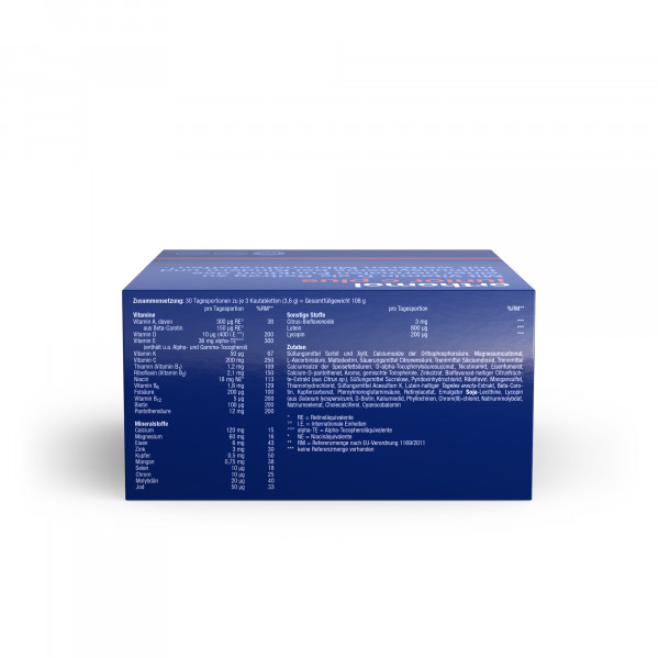 Ascorbinsäure, Thiamin hydrochlorid, Thiamin, Riboflavin, Nicotinamid, Vitamin B3, Antipellagra-Vitamin, Nicotinsäureamid, Niacinamid, Pyridoxin hydrochlorid, Pyridoxin, Folsäure, Cyanocobalamin, Betacaroten, Biotin, Coenzym R, Vitamin B7, Vitamin H, Tricalciumphosphat, Calcium-Ion, Magnesiumcarbonat, Magnesium-Ion, Eisen(II)-fumarat, Eisen(II)-Ion, Retinol, Zink-Ion, Mangan(II)-sulfat, Retinol, Kaliumiodid, Kaliumjodid, Iodid-Ion, Sorbitol, Colecalciferol, Xylitol, Maltodextrin, Betanin, Citronensäure, Siliciumdioxid, Waldfrucht-Aroma, Tocopherolgemisch, Sucralose, Acesulfam kalium, Colecalciferol, (R.R.R)-α-Tocopherol hydrogensuccinat, (R.R.R)-α-Tocopherol-Äquivalent