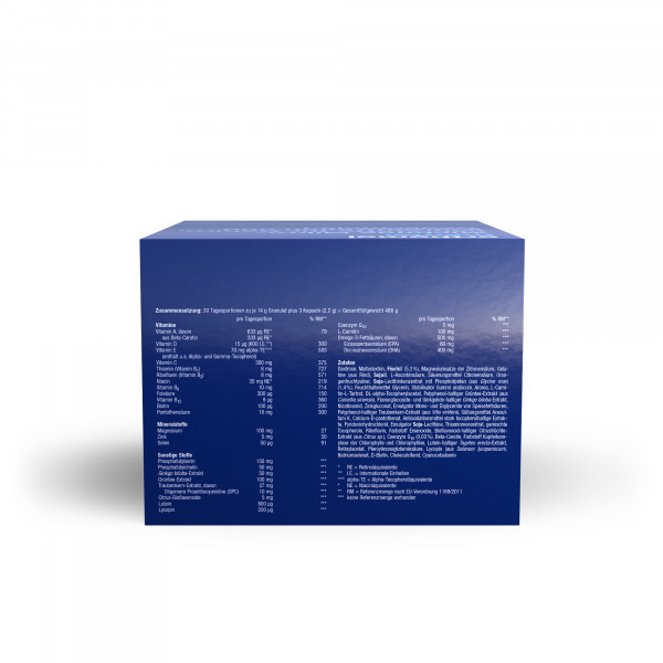 • Die Omega-3-Fettsäure Docosahexaensäure (DHA) trägt zur Erhaltung der normalen Gehirnfunktion bei. Die positive Wirkung stellt sich bei einer täglichen Aufnahme von min. 250 mg DHA ein. Thiamin (Vitamin B1), Riboflavin (Vitamin B2), Vitamin B6, Vitamin B12, Biotin, Niacin, Vitamin C und