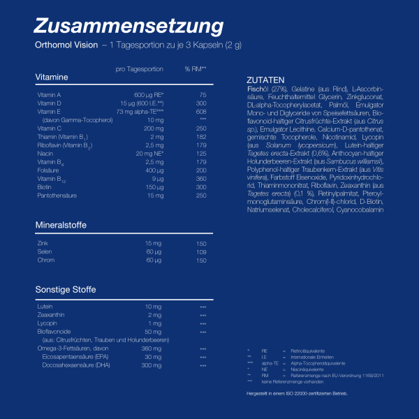 Orthomol Vision ist ein Nahrungsergänzungsmittel. Wichtige Mikronährstoffe für die Augen. Mit Vitamin A, Vitamin B2 (Riboflavin), Zink und der Omega-3-Fettsäure DHA zur Aufrechterhaltung der normalen Sehkraft. Mit Lutein und Zeaxanthin.