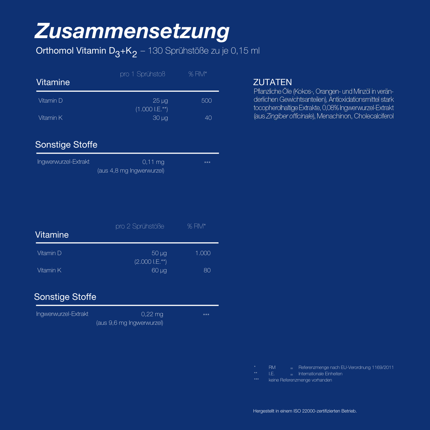 Pflanzliche Öle (Kokos-, Orangen- und Minzöl in veränderlichen Gewichtsanteilen), Antioxidationsmittel stark tocopherolhaltige Extrakte, 0,08 % Ingwer-Extrakt (aus Zingiber officinale), Menachinon, Cholecalciferol