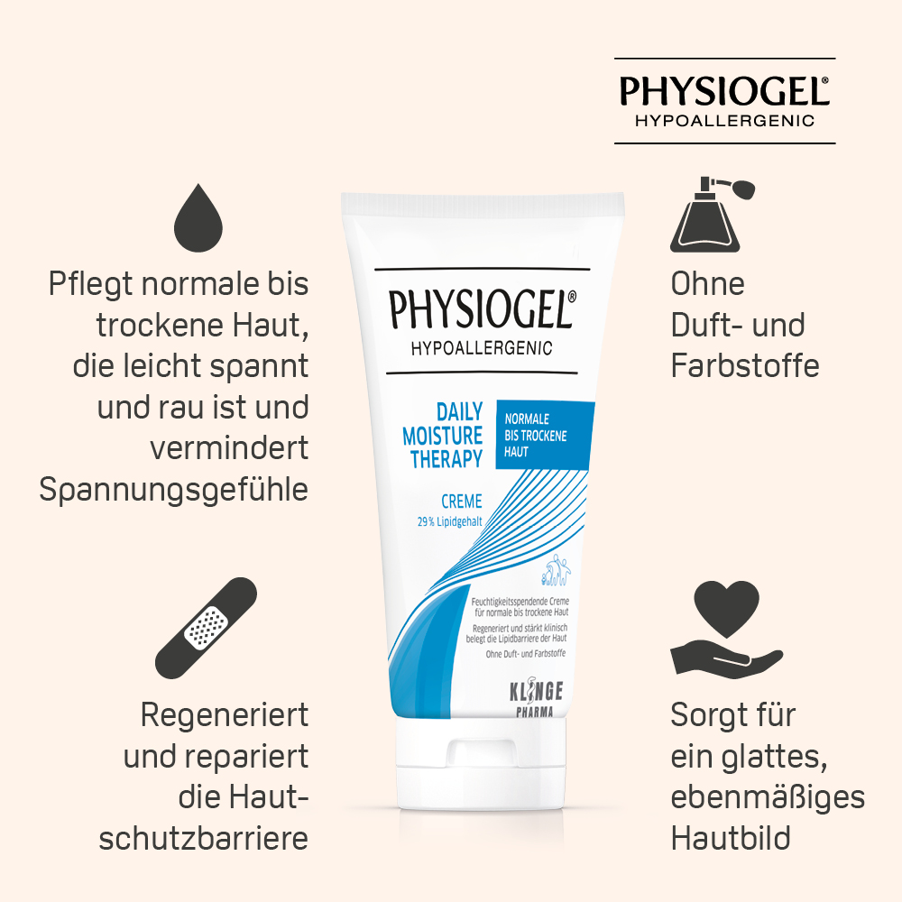 Die Creme spendet Feuchtigkeit, regeneriert und repariert die Haut und schützt vor wiederkehrender Trockenheit. Sie ist hautverträglich, klinisch getestet und frei von Duft- und Farbstoffen. Dank der innovativen BioMimetic Technologie der PHYSIOGEL Daily Moisture Therapy Creme wird die gestörte Hautbarriere aufgrund ihrer einzigartigen Zusammensetzung nach dem Vorbild gesunder, widerstandsfähiger Haut repariert und regeneriert.