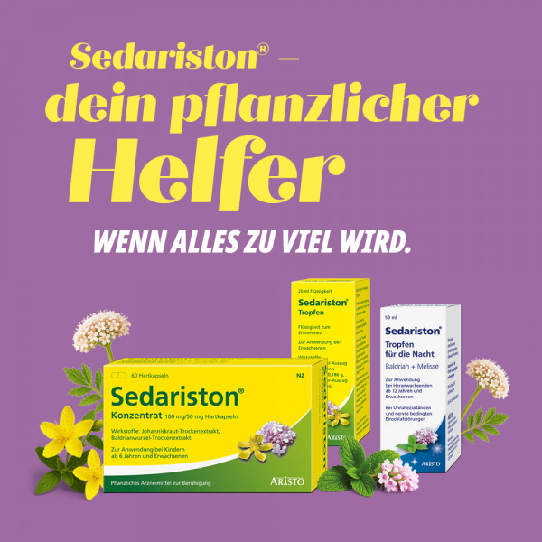 Was ist Sedariston® Tropfen und wann wird es eingesetzt? Sedariston® Tropfen ist ein pflanzliches Arzneimittel zur Besserung bei nervlicher Belastung und zur Unterstützung des Schlafs. Unsere Sedariston® Tropfen gehören zu den traditionellen Arzneimitteln, die aufgrund langjähriger Anwendung für das Anwendungsgebiet registriert und bekannt sind. Sedariston® Tropfen haben sich in den Jahrzehnten der Anwendung auch bei nervös bedingten Störungen von Organfunktionen, wie Magen-Darm-Beschwerden und Herzklopfen, bewährt¹. Die Sedariston® Tropfen können bei körperlich spürbaren Unruhesymptomen helfen. Baldrian wirkt beruhigend, Johanniskraut stimmungsaufhellend und der Zusatz der Melisse wirkt beruhigend und krampflösend bei nervösen Magen-Darmbeschwerden
