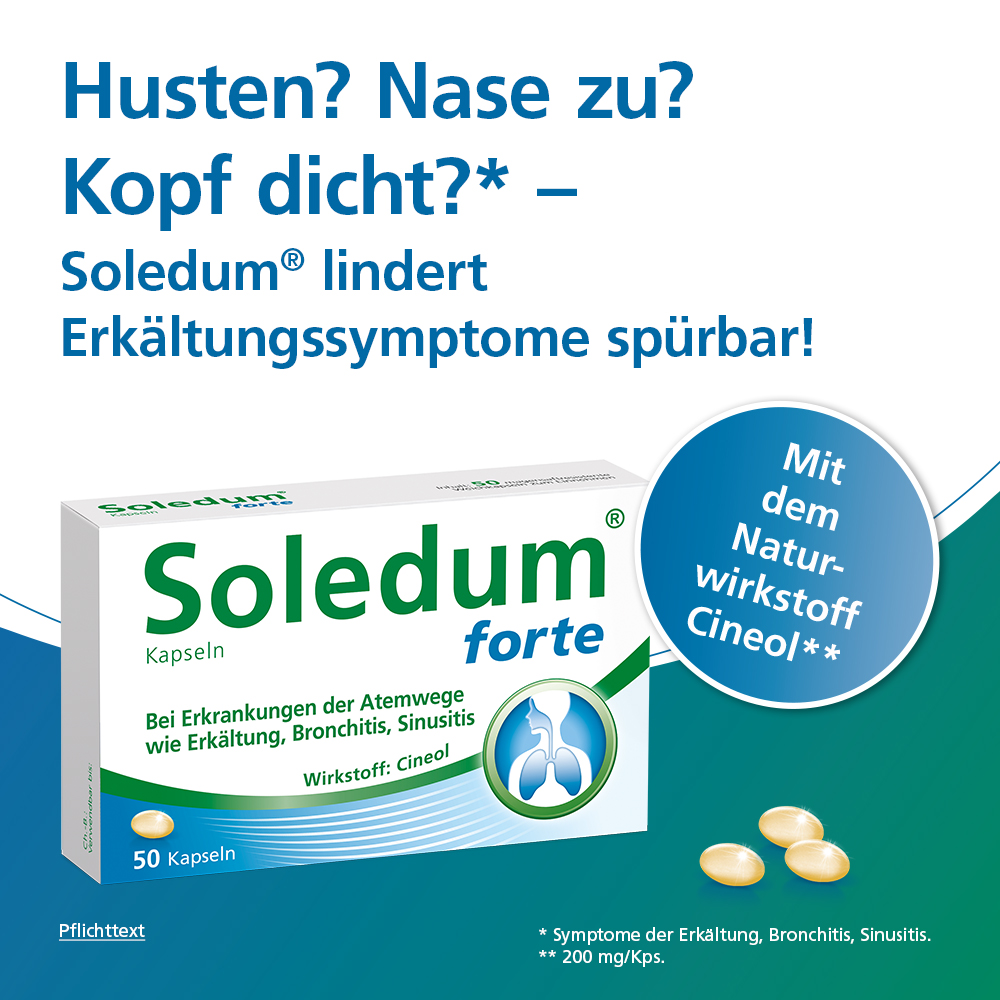 Der naturbasierte Wirkstoff Cineol wirkt schleimlösend und entzündungshemmend. Sinnvoll ist hierbei der Kontakt von Cineol mit dem Wirkort - der angegriffenen Schleimhaut der Atemwege. Dieser Kontakt erfolgt dadurch, dass Cineol nach der Einnahme der Soledum® Kapseln forte auf natürlichem Weg über die Blutbahn auch zur Lunge transportiert wird und dort abgeatmet wird.