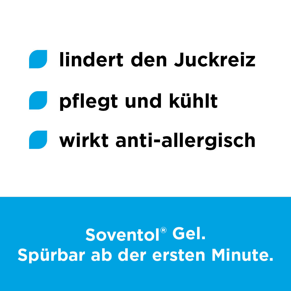 Kühlen ist bei Insektenstichen eine wichtige Erste-Hilfe-Maßnahme. Auch hier punktet Soventol® Gel auf der ganzen Linie: Physikalisch erzeugt die Gelgrundlage eine angenehme Kühlung und verstärkt so die Juckreizlinderung. Beim Antrocknen des Gels bildet sich ein Film, der die gereizte Haut wie ein hauchdünnes Heilpflaster schützt.