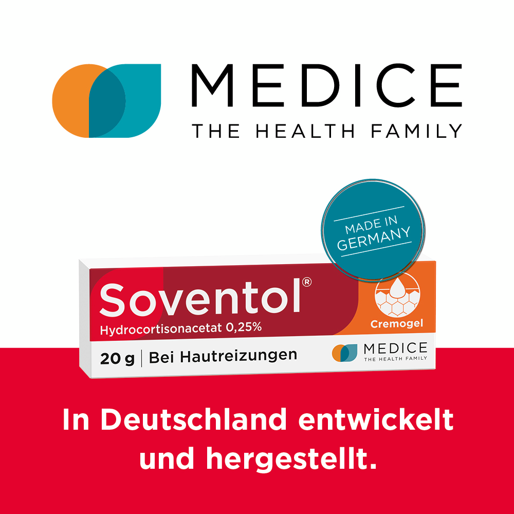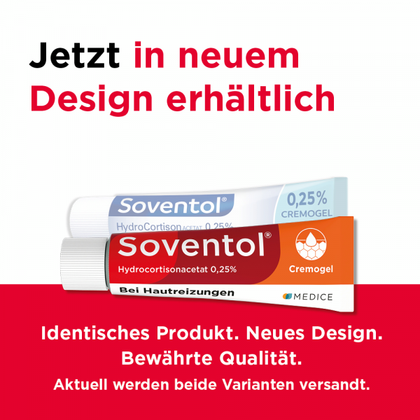 Soventol® HydroCortisonACETAT 0,25% überzeugt zudem durch eine innovative Galenik: Die Cremogel-Formulierung wurde eigens von Hautärzten entwickelt. Das Cremogel kühlt wie ein Gel und pflegt wie eine Creme. Ein weiteres Plus: Das Cremogel lässt sich leicht auftragen,
