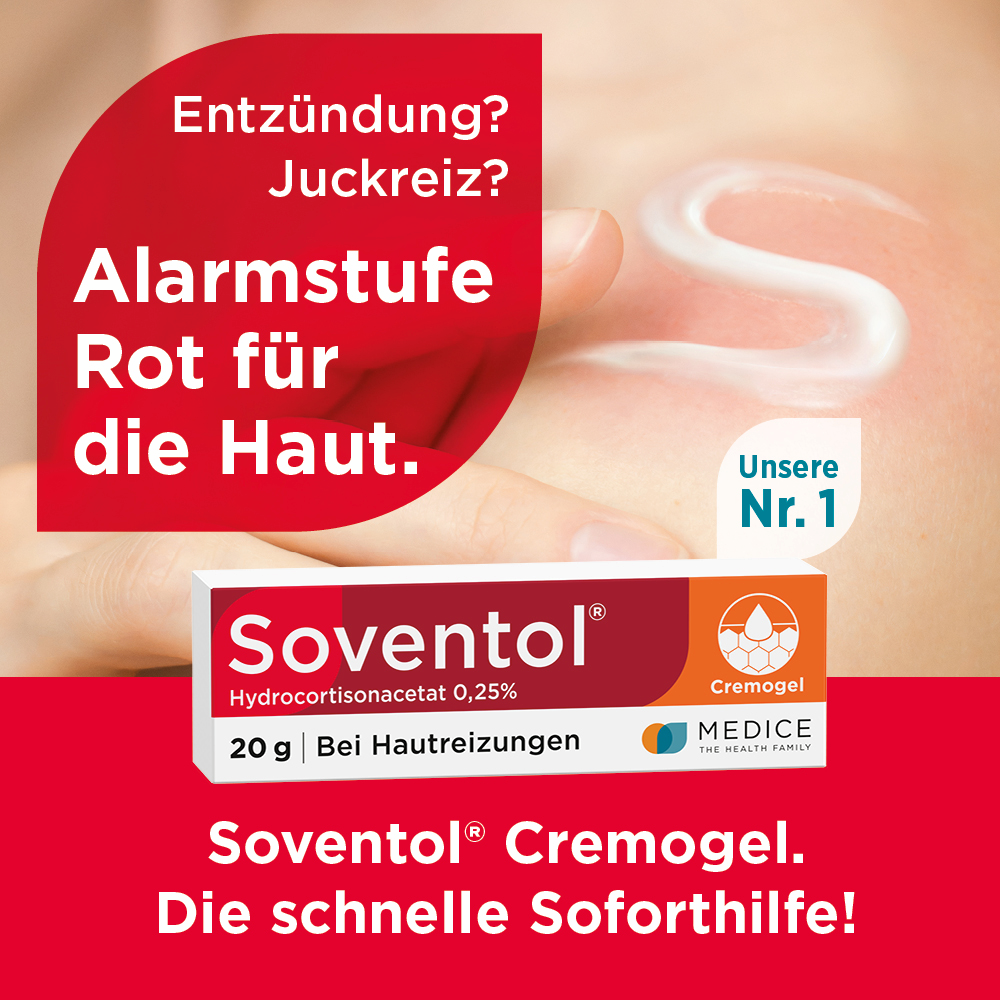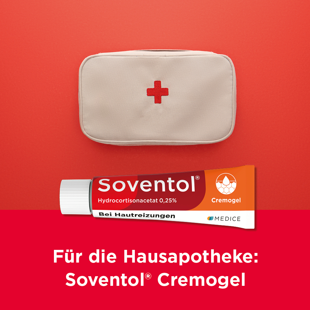 Das Cremogel kühlt wie ein Gel und pflegt wie eine Creme. Damit eignet sich Soventol® HydroCortisonACETAT 0,25% Cremogel speziell bei gereizter Sommerhaut (z. B. Sonnenbrand, Sonnenallergie), Hautentzündungen (z. B. bei entzündeten Insektenstichen) sowie bei Juckreiz.