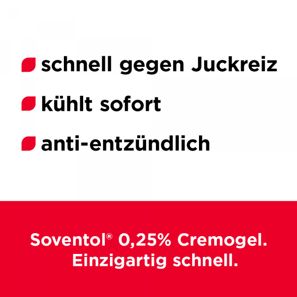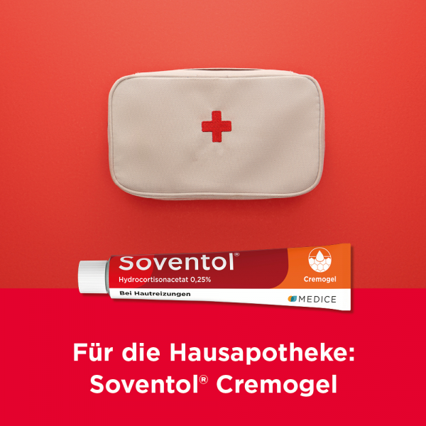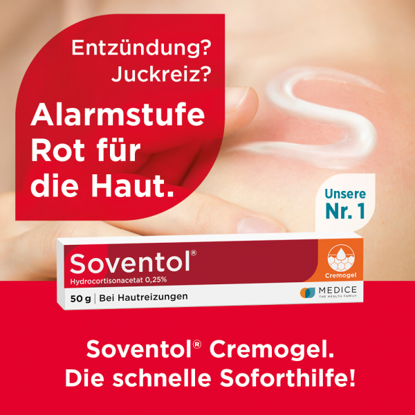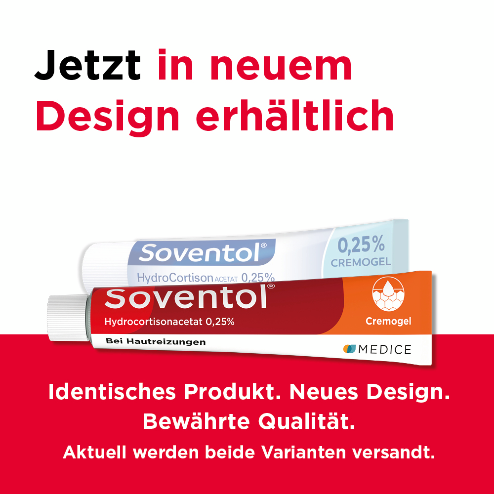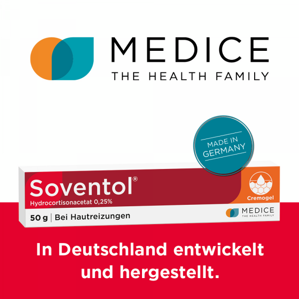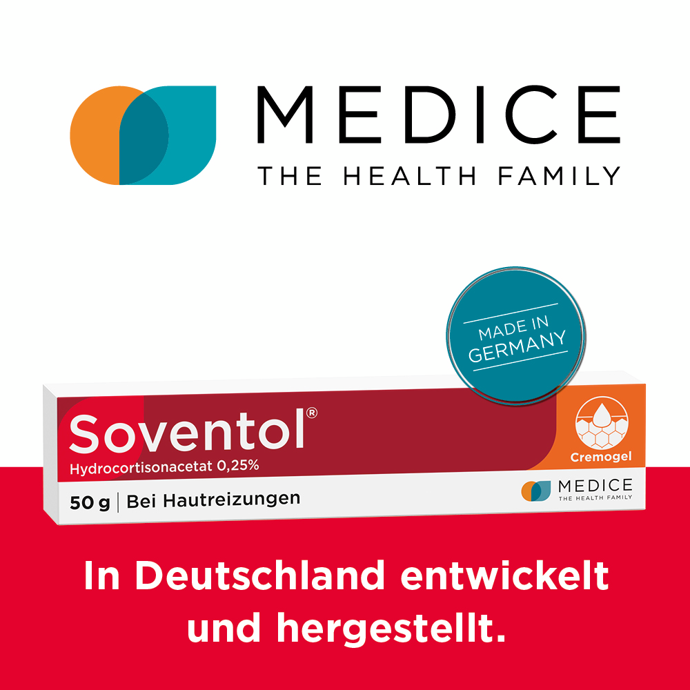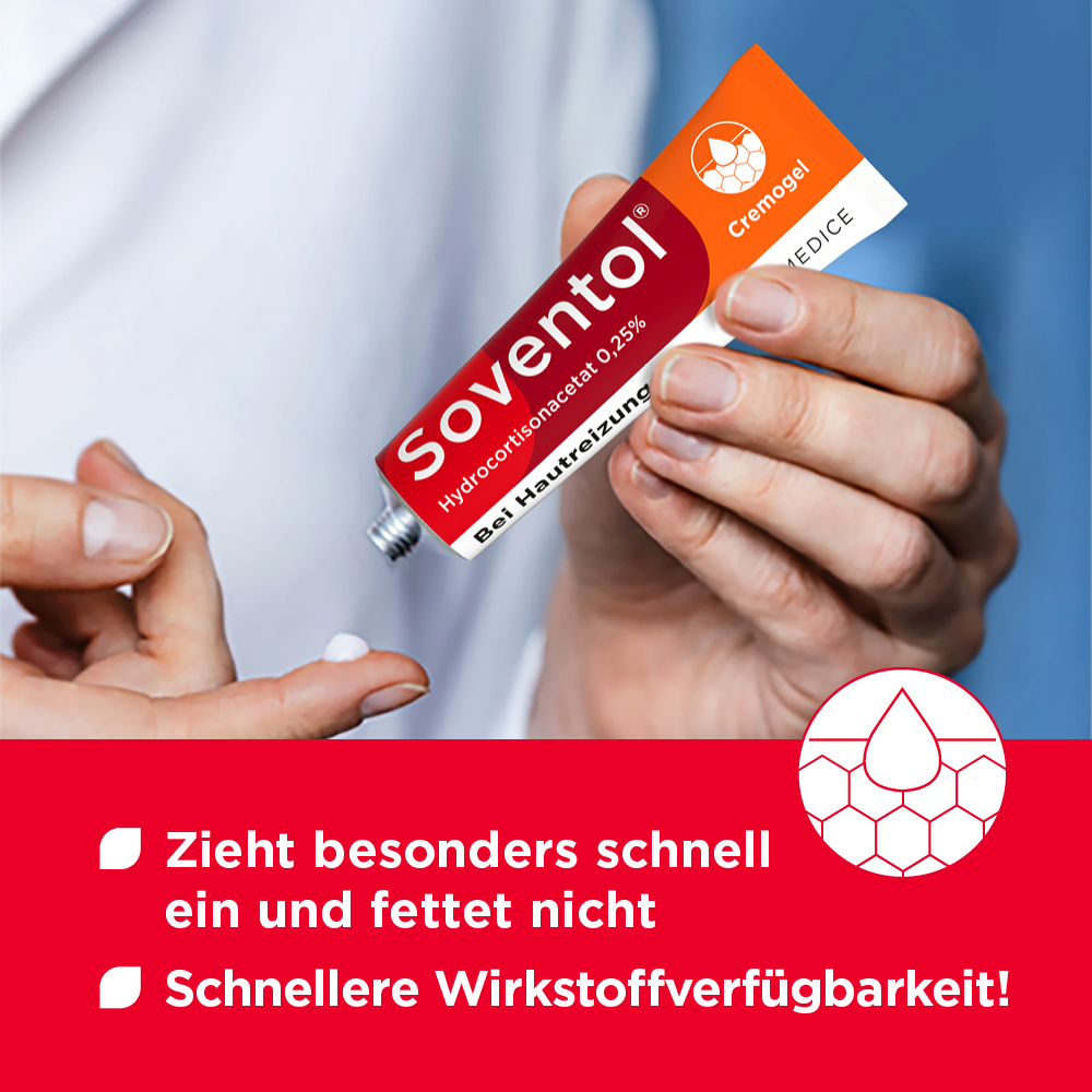 Soventol® HydroCortisonACETAT 0,25% überzeugt zudem durch eine innovative Galenik: Die Cremogel-Formulierung wurde eigens von Hautärzten entwickelt. Das Cremogel kühlt wie ein Gel und pflegt wie eine Creme. Ein weiteres Plus: Das Cremogel lässt sich leicht auftragen, zieht schnell ein und ist auch für große Hautareale (z. B. Schultern, Rücken) geeignet.